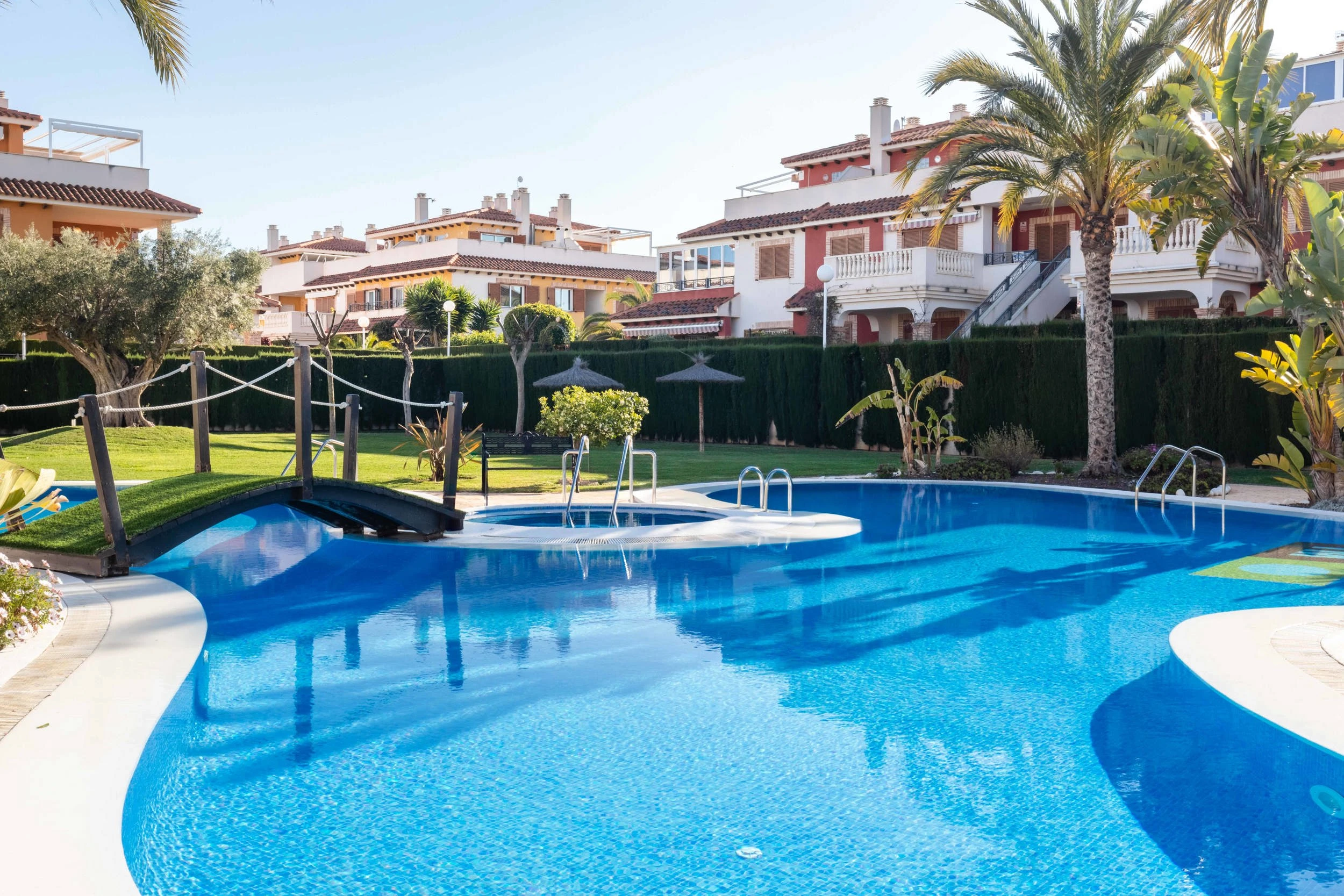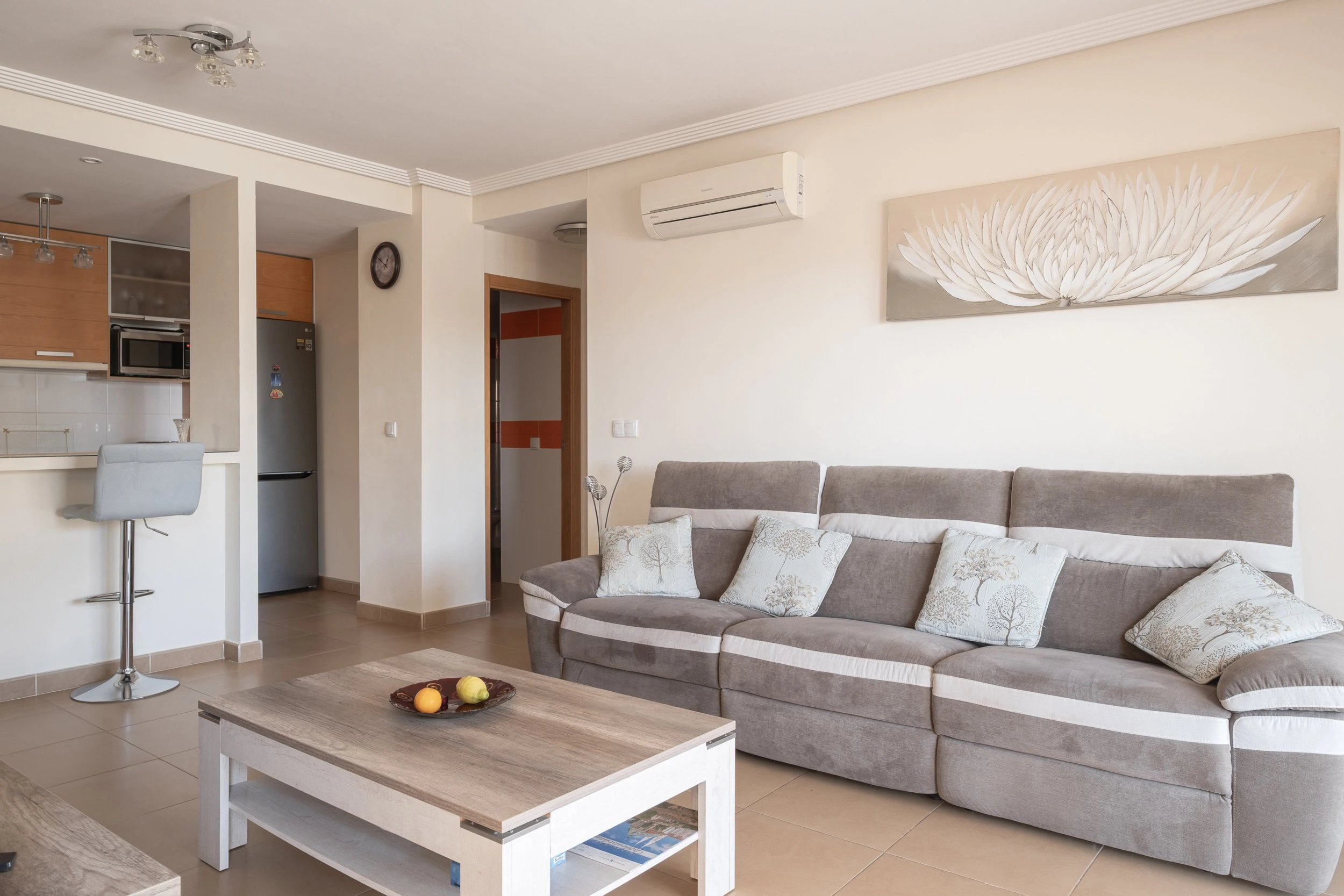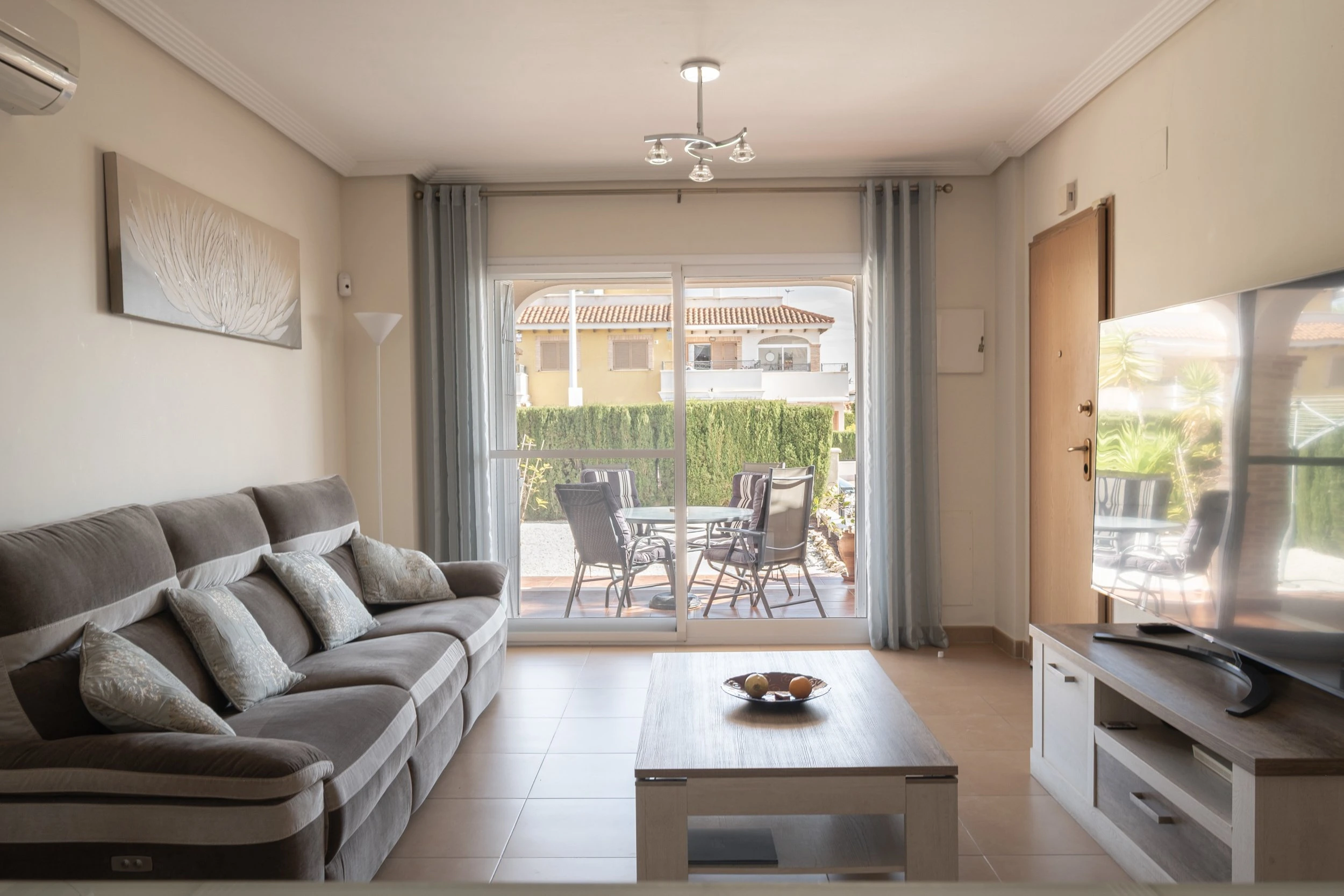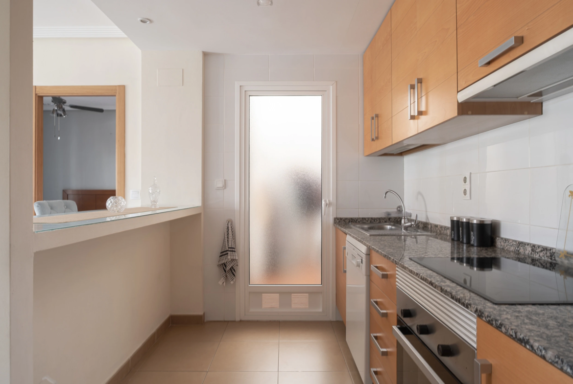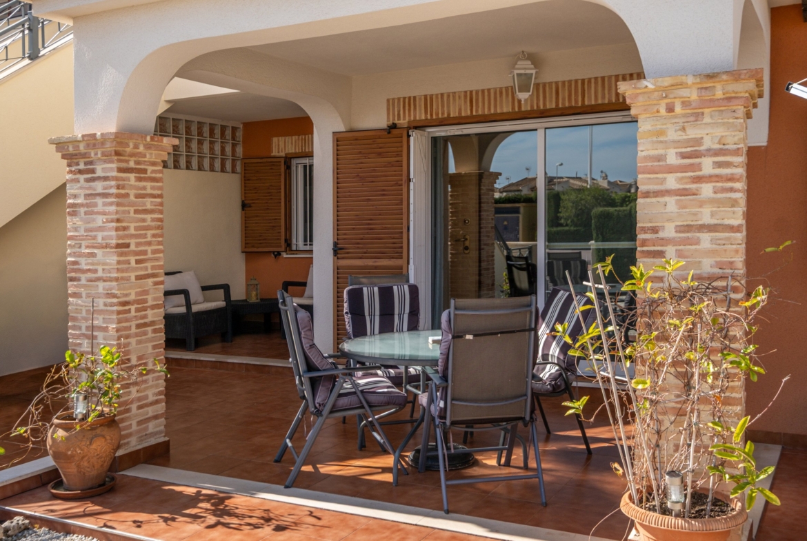 Geidžiamoje „Zeniamar 9“ širdyje esantis butas idealiai tinka ieškantiems patogaus būsto viename populiariausių Orihuela Costa rajonų. Nors viršuje turite kaimynus, dėl erdvios, į rytus orientuotos terasos jausitės tarsi nuosavame namelyje. Terasa dovanoja nuostabią rytinę saulę ir gausybę vietos tiek lauko baldams, tiek valgomojo komplektui.