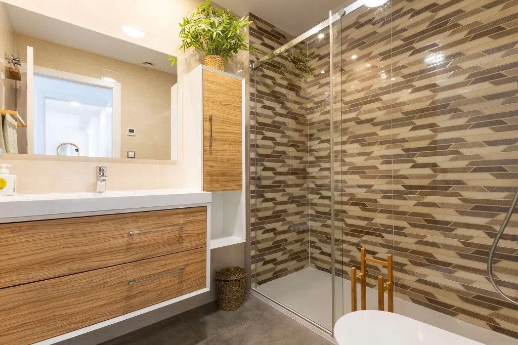 Living-dining room with an open kitchen that creates a modern and functional environment, two double bedrooms with built-in wardrobes, and two bathrooms with walk-in showers and underfloor heating.