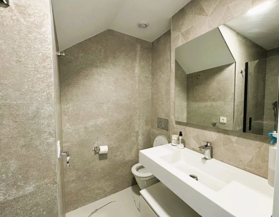 Antras miegamasis su įmontuota spinta ir antruoju vonios kambariu. Toliau – laiptai, vedantys į 60 m2 soliariumą su įspūdingais jūros ir apylinkių vaizdais.