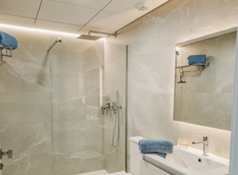 - Papildomas komfortas: Funkcionali ir jau apstatyta drabužinė bei du elegantiški, pilnai sukomplektuoti vonios kambariai.