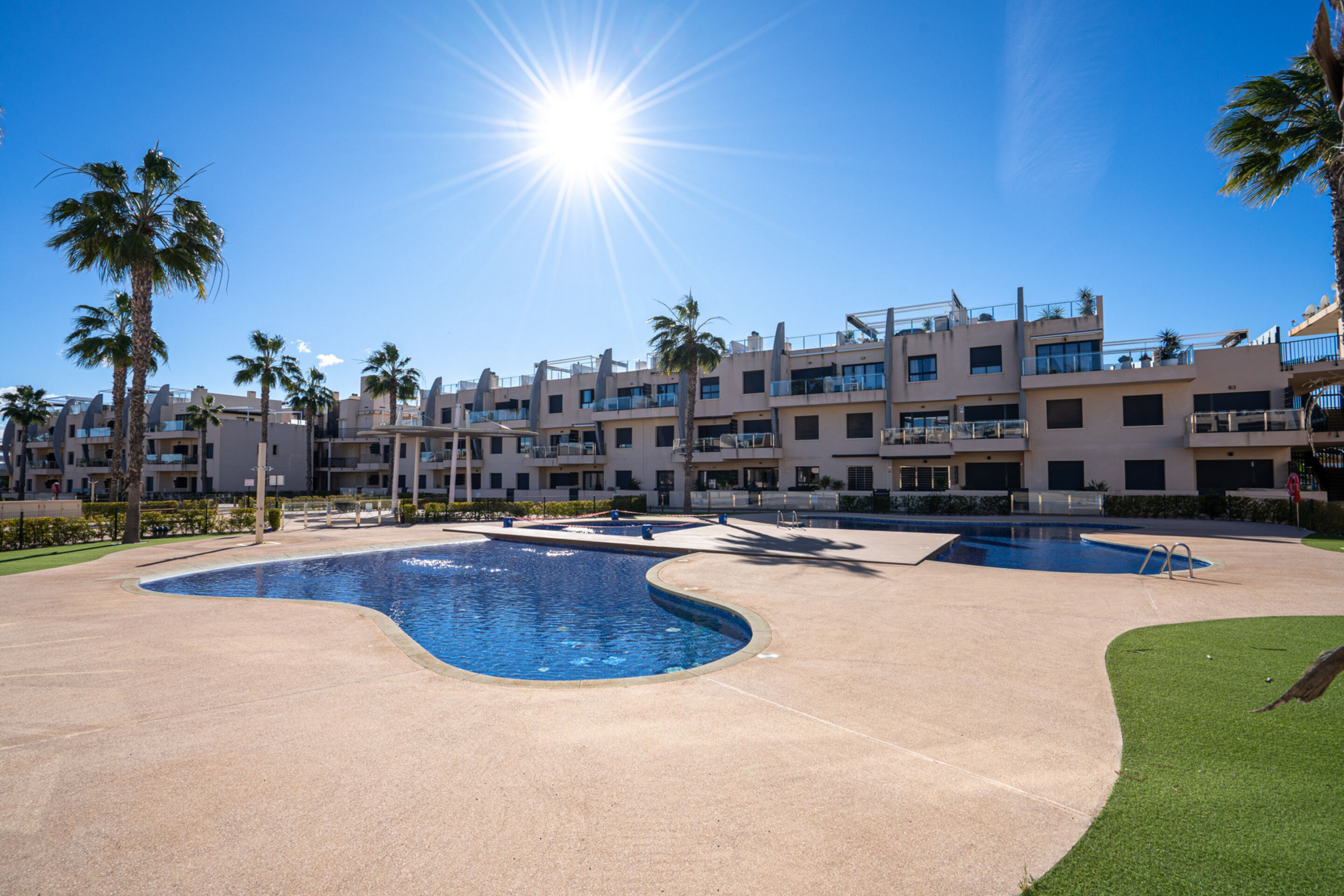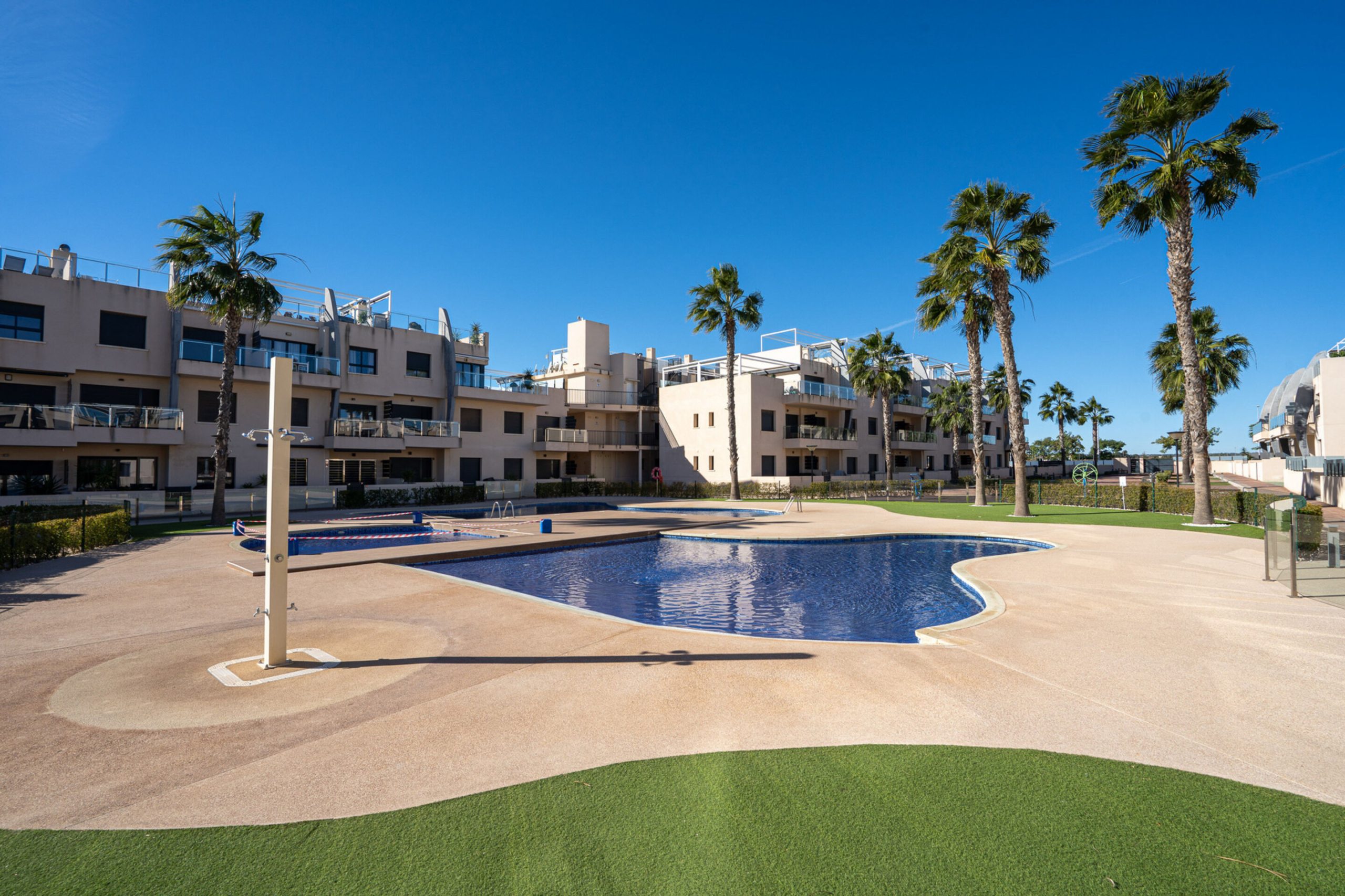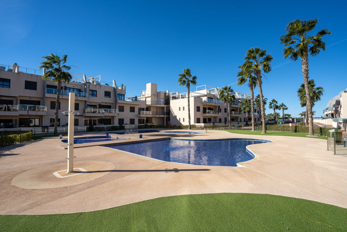 Apartamentai priklauso saugiai, uždarai teritorijai, kuri primena prabangų atostogų kaimelį. Čia rasite ne vieną, o du bendruomenės baseinus, skirtus atsivėsinti karštomis Ispanijos dienomis, bei kruopščiai sutvarkytas žaliąsias zonas, skirtas kaimynų bendravimui ir ramiam poilsiui.