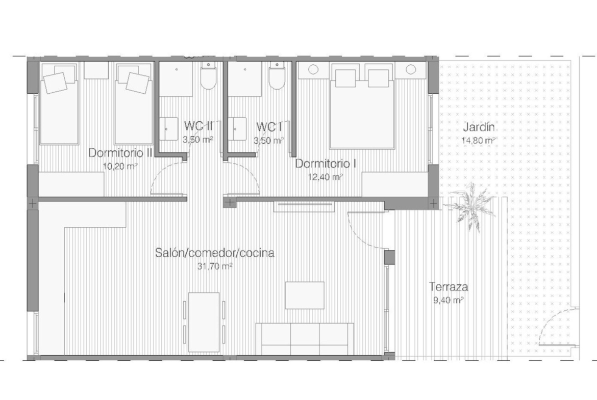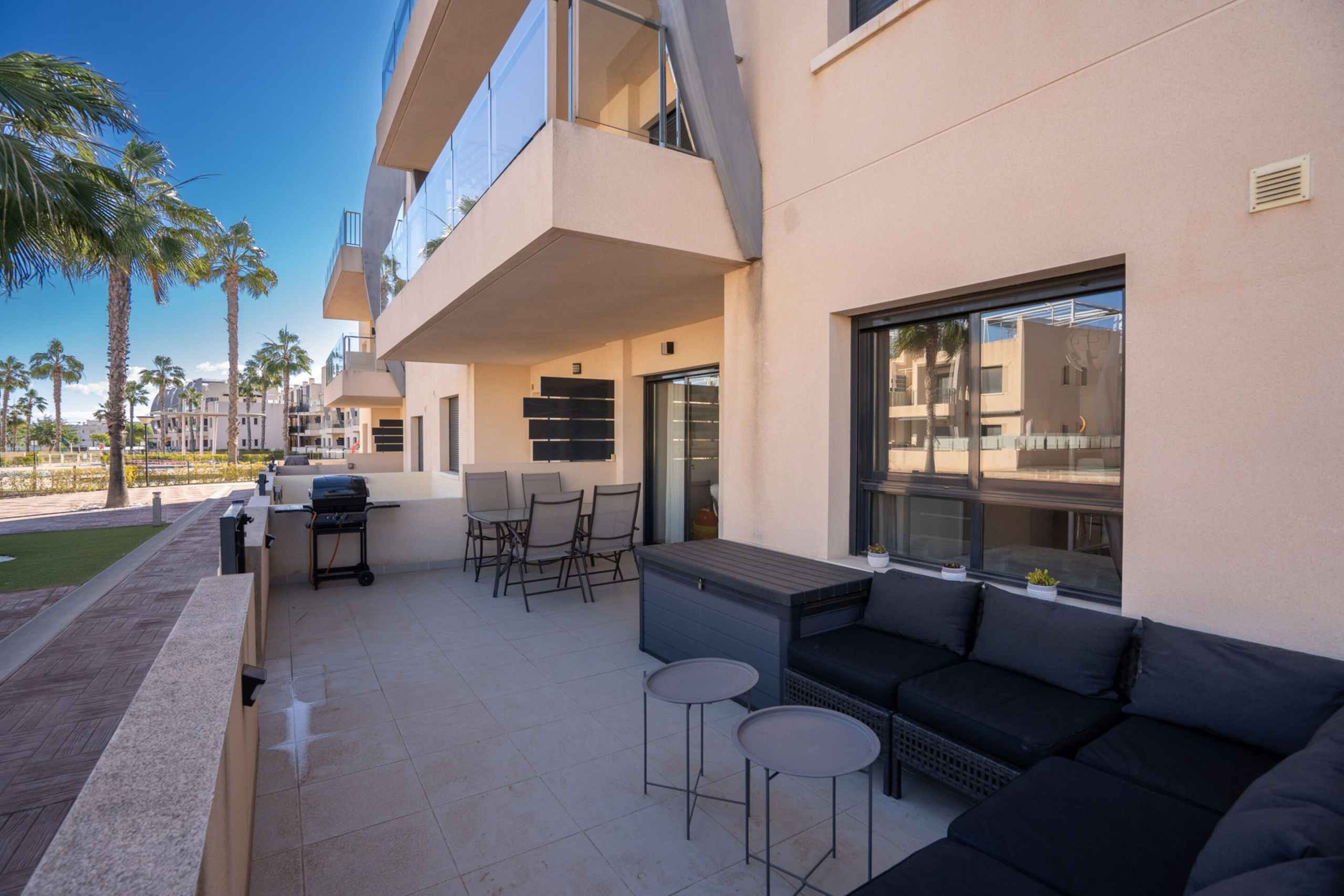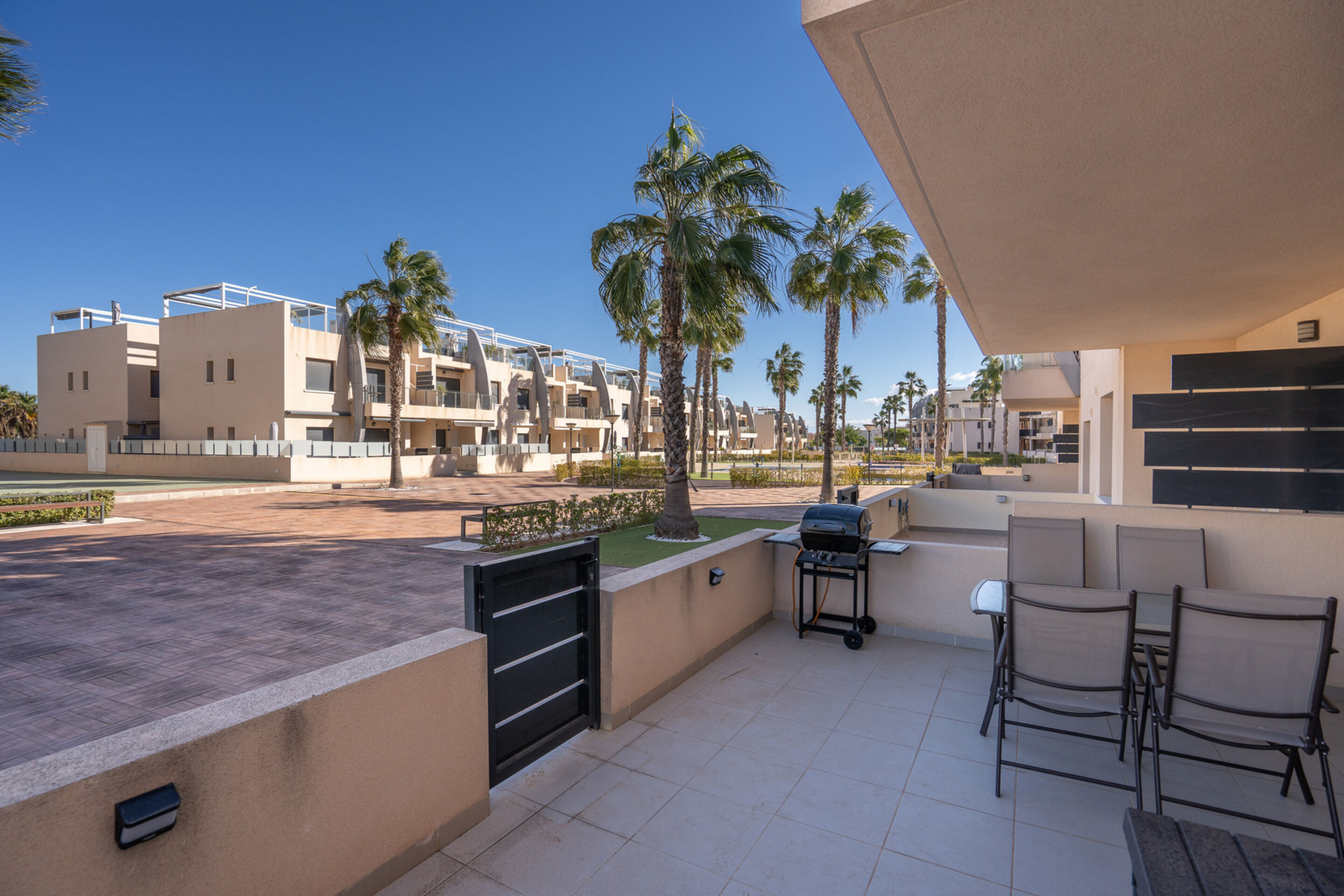 Apartamentai priklauso saugiai, uždarai teritorijai, kuri primena prabangų atostogų kaimelį. Čia rasite ne vieną, o du bendruomenės baseinus, skirtus atsivėsinti karštomis Ispanijos dienomis, bei kruopščiai sutvarkytas žaliąsias zonas, skirtas kaimynų bendravimui ir ramiam poilsiui.
