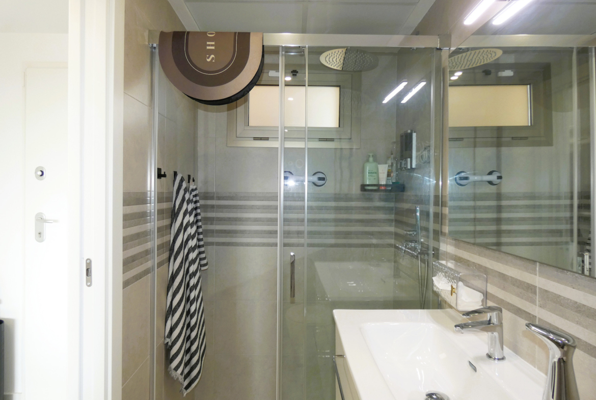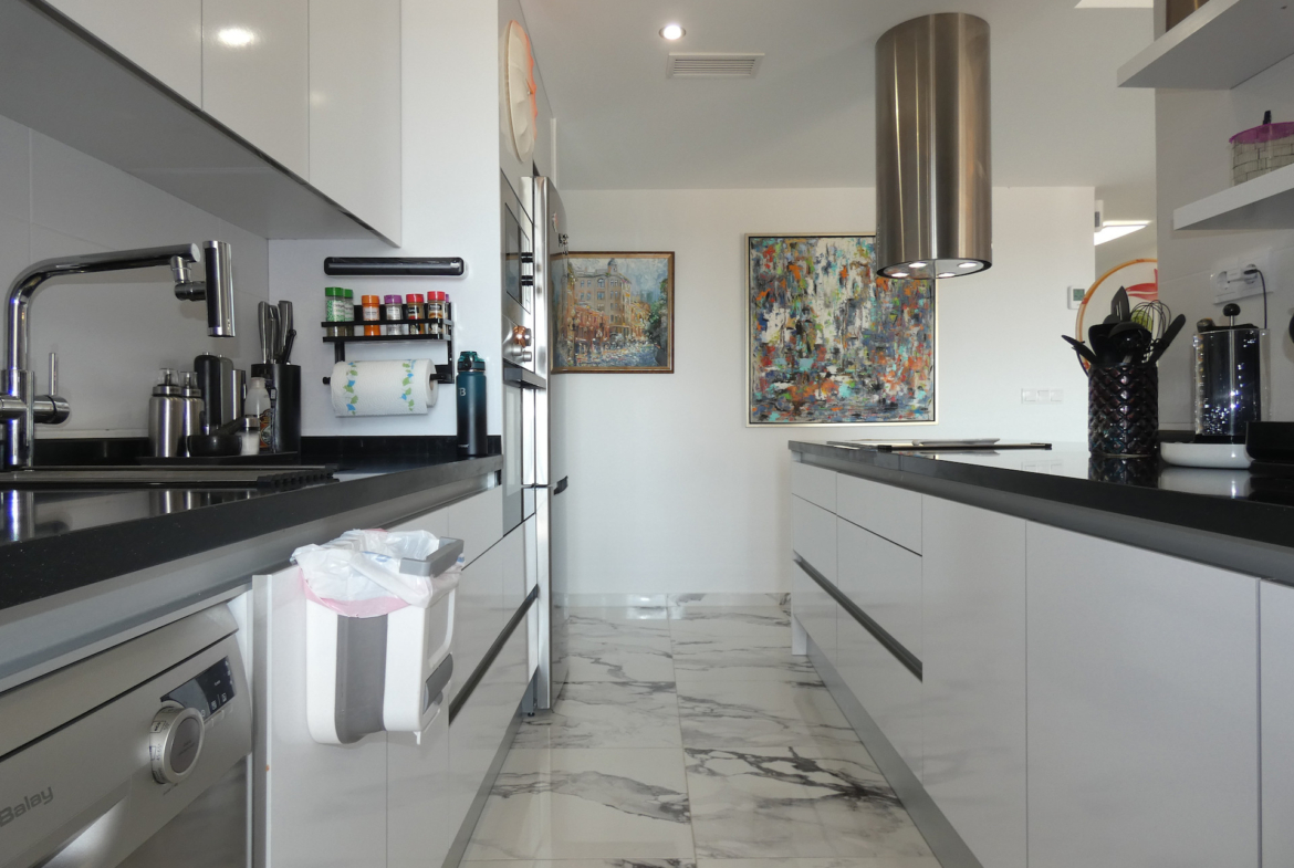 Bute yra du erdvūs miegamieji su įmontuotomis spintomis, du modernūs vonios kambariai su dušais ir šviesi svetainė su valgomojo zona bei atvira virtuve, sukurianti jaukią ir modernią aplinką. Iš svetainės patenkama į didelę 20 m² ploto terasą į pietus su vaizdu į jūrą, puikiai tinkančią mėgautis saule ištisus metus arba maloniai praleisti vakarus lauke.