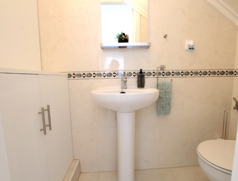 Pirmame aukšte taip pat yra dušo kambarys su praustuvu ir tualetu. Dabartiniai savininkai išėmė dušo padėklą, kad būtų galima papildomai susidėti daiktus, nors jį galima lengvai atkurti.