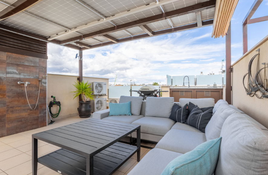 Kotedže yra kelios terasos: dvi pirmame aukšte, o taip pat balkonas ir didelė stogo terasa saulėtoje vietoje. Stogo terasoje įrengta lauko virtuvė ir dušas, todėl tai puiki vieta atsipalaiduoti, vakarieniauti ir pabendrauti. Čia yra daug vietos poilsio baldams, valgomojo komplektui ir gultams.