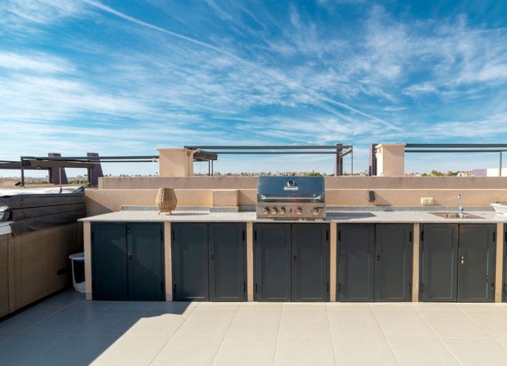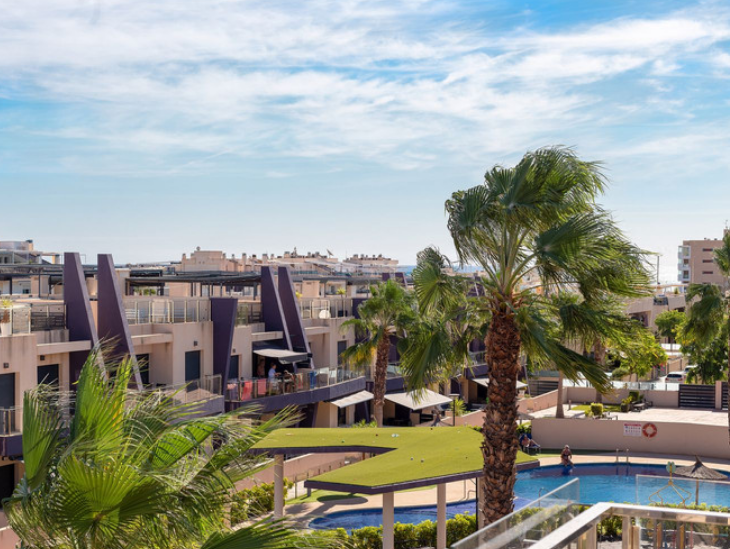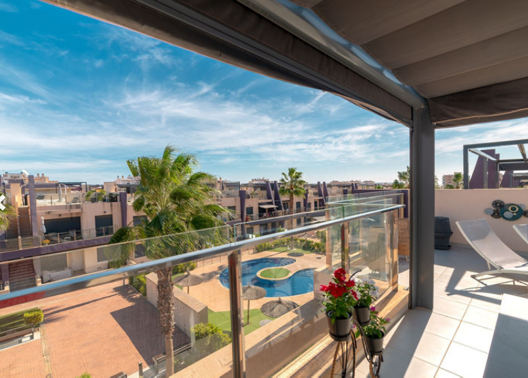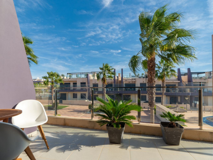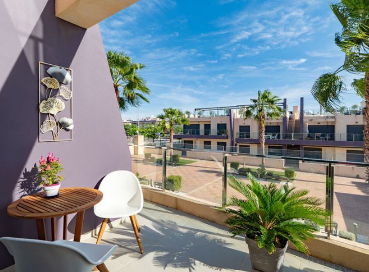 Iš svetainės patenkama į didįjį balkoną, iš kurio atsiveria raminantis vaizdas į puikiai prižiūrimą vidinį kiemą ir baseino zoną. Tai puiki vieta rytiniam kavos puodeliui saulėkaitoje ar popietės poilsiui maloniame šešėlyje.