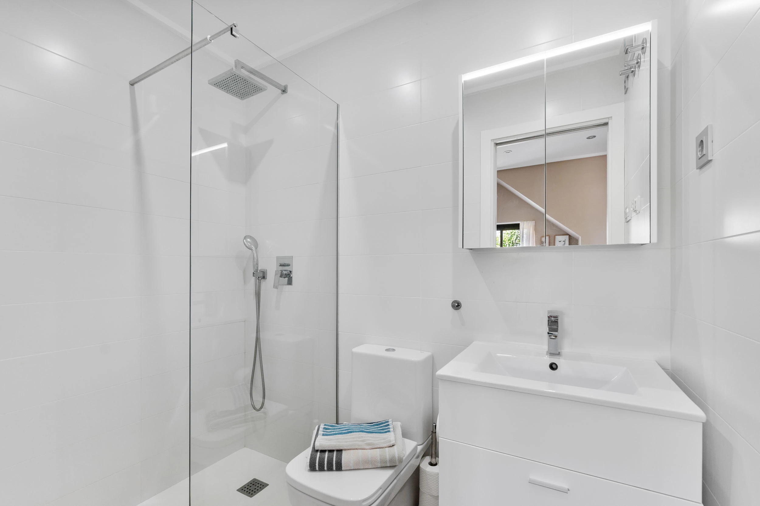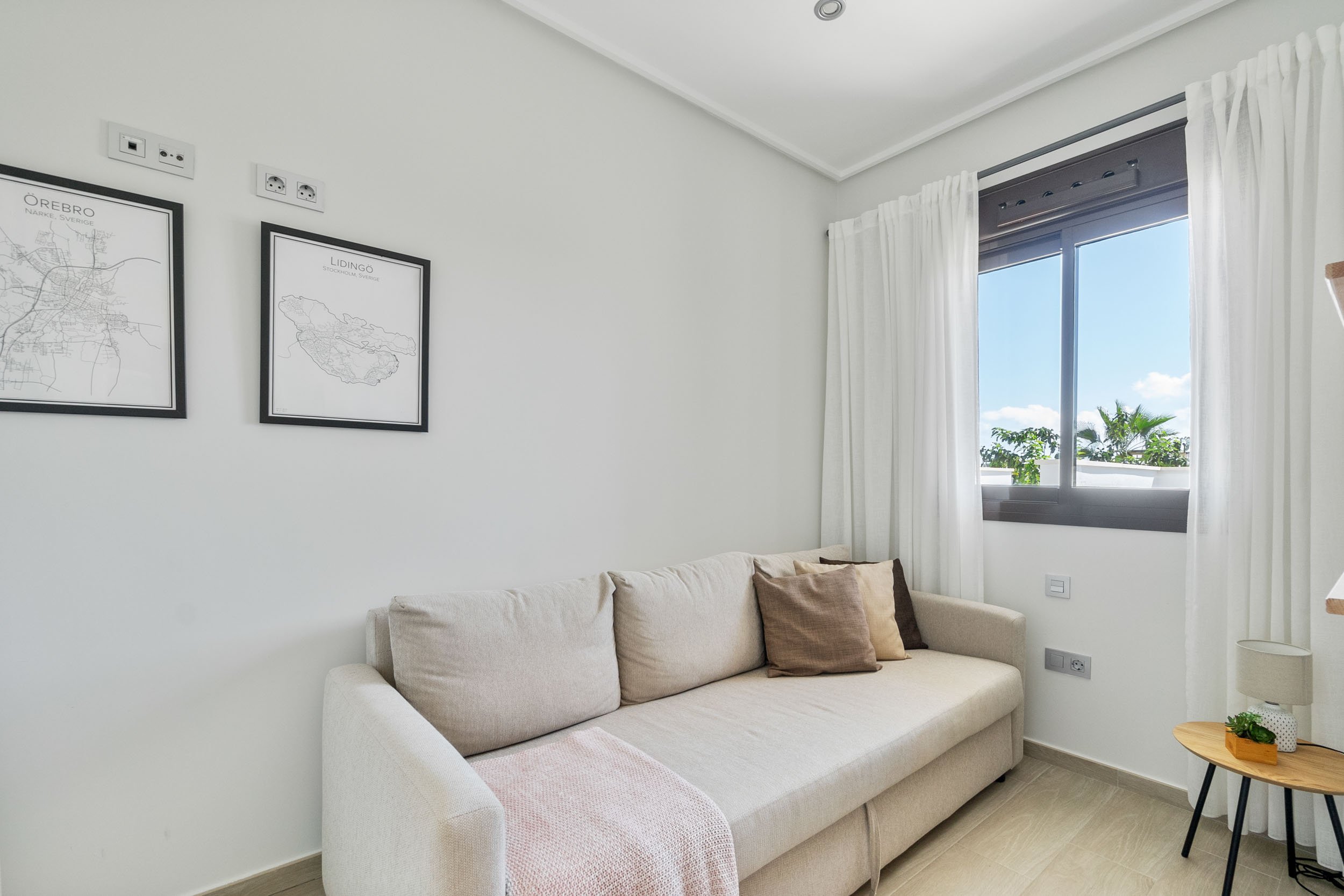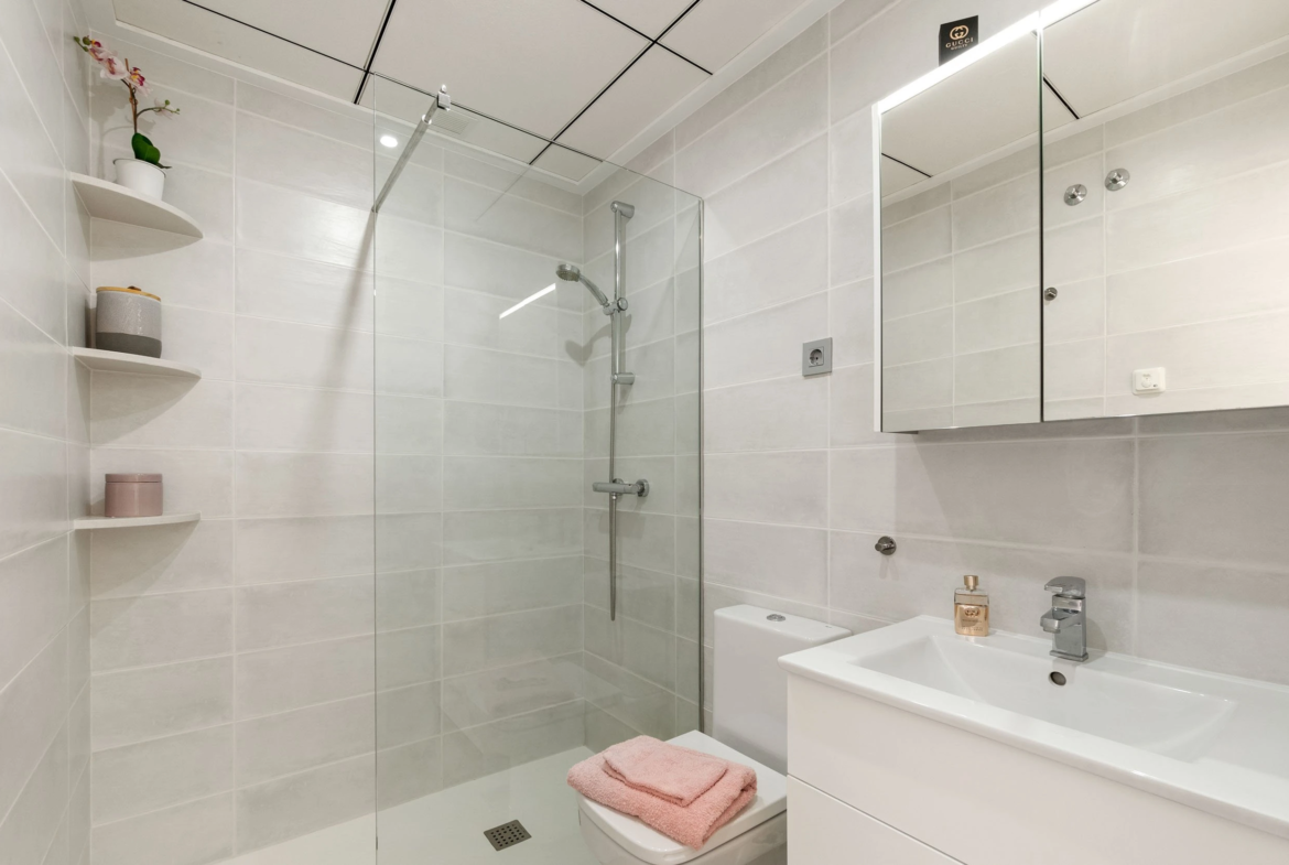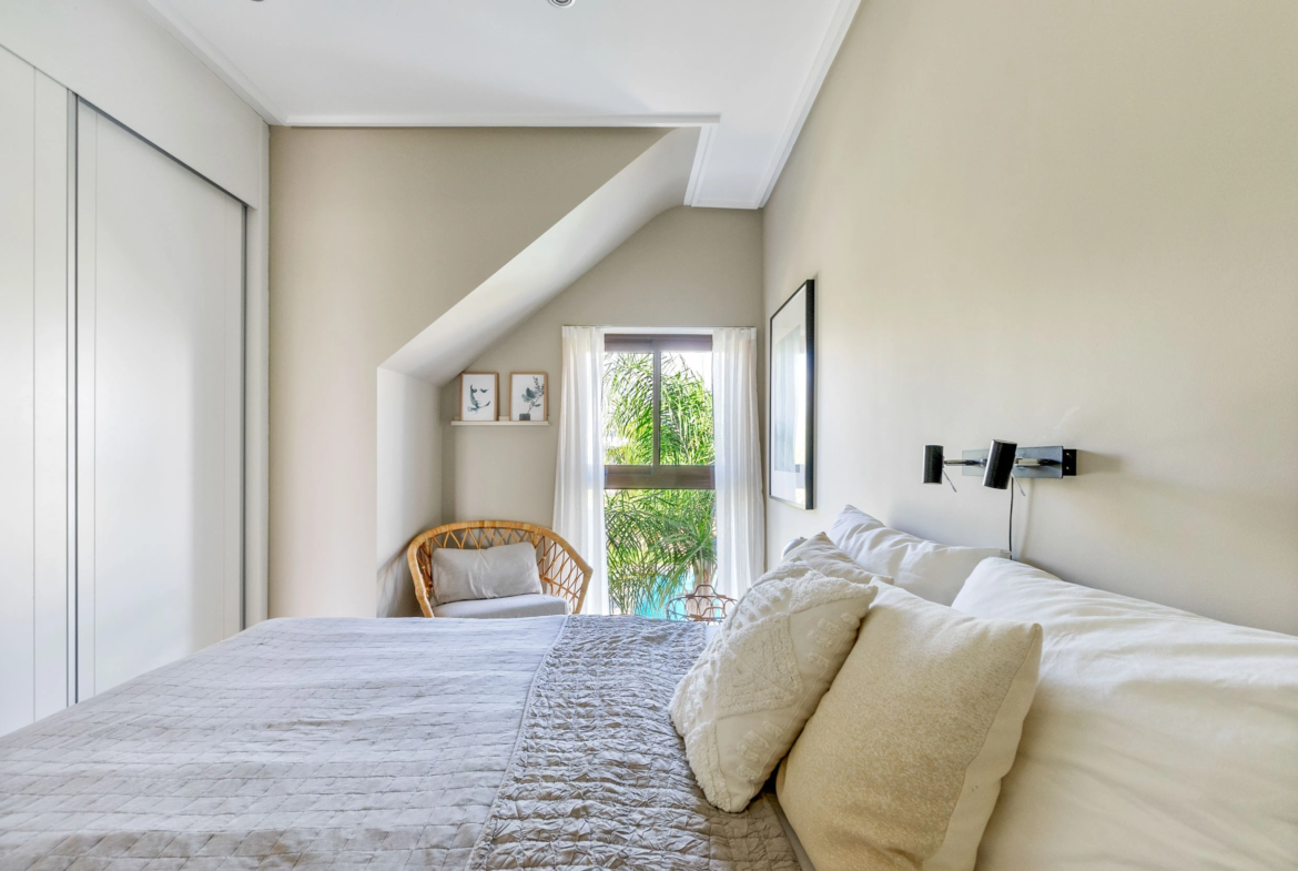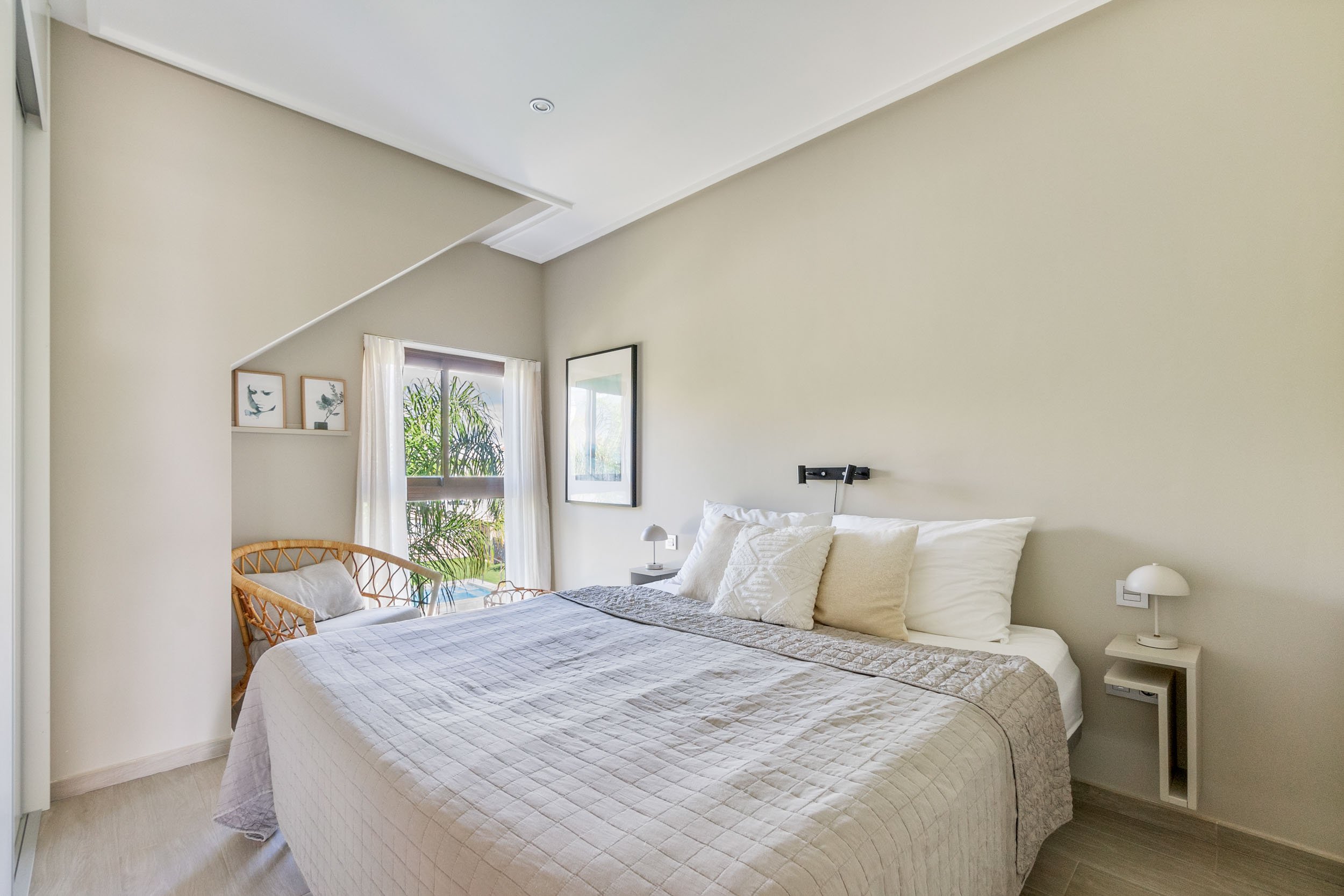 Butą sudaro du proporcingai išdėstyti miegamieji, abu įrengti tokiu pat šviesiu ir harmoningu stiliumi kaip ir likusi namo dalis. Įmontuotose spintose yra daug vietos daiktams susidėti. Pagrindiniame miegamajame taip pat yra išskirtinis vonios kambarys su dušu ir vaizdu į gražią baseino zoną su palmėmis ir žaliosiomis erdvėmis. Antrasis vonios kambarys išlaiko tą patį aukštą standartą, pasižymi moderniu ir stilingu dizainu.