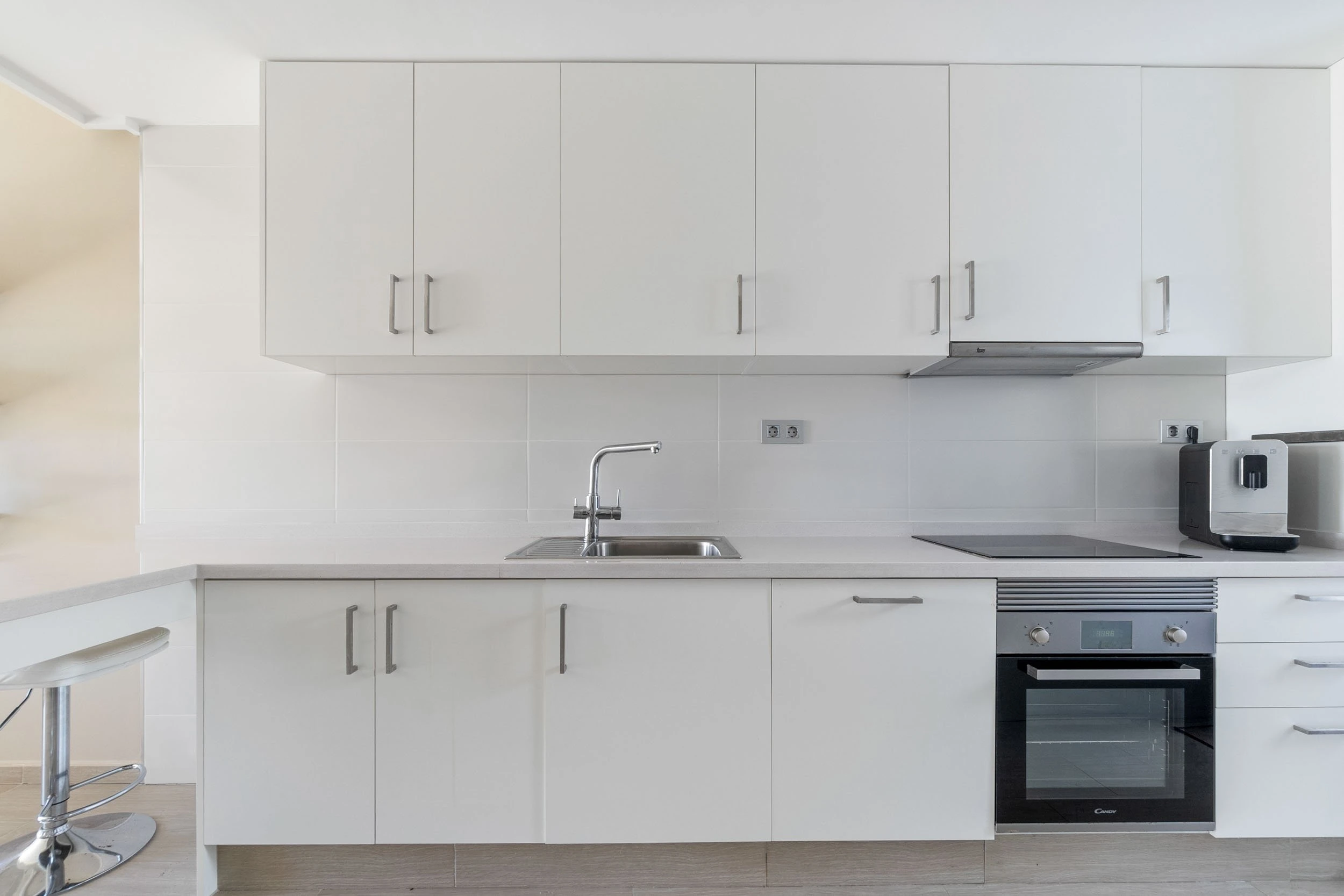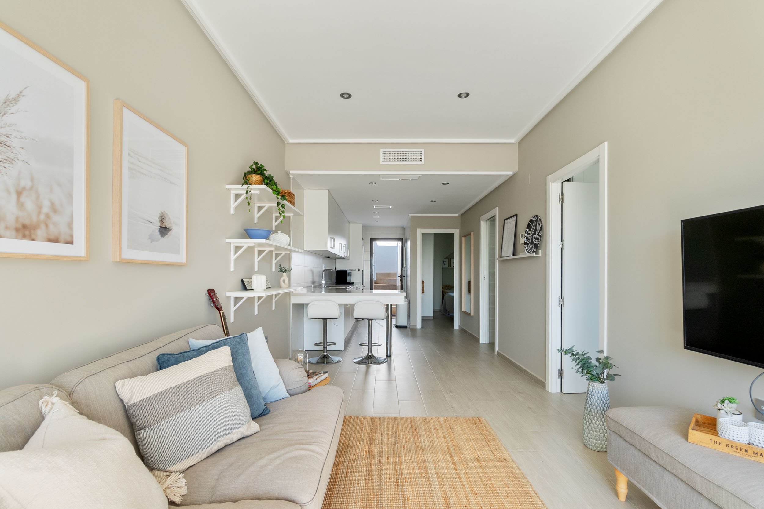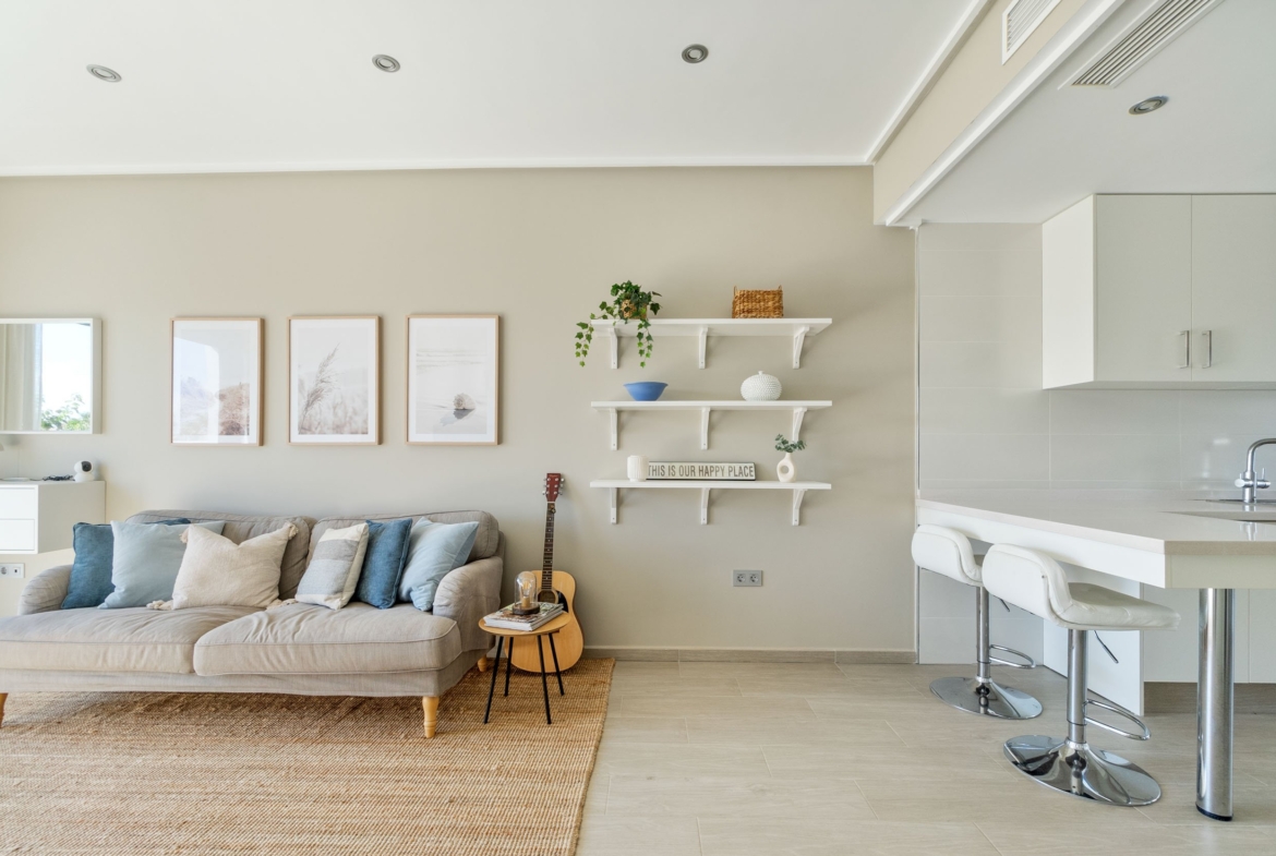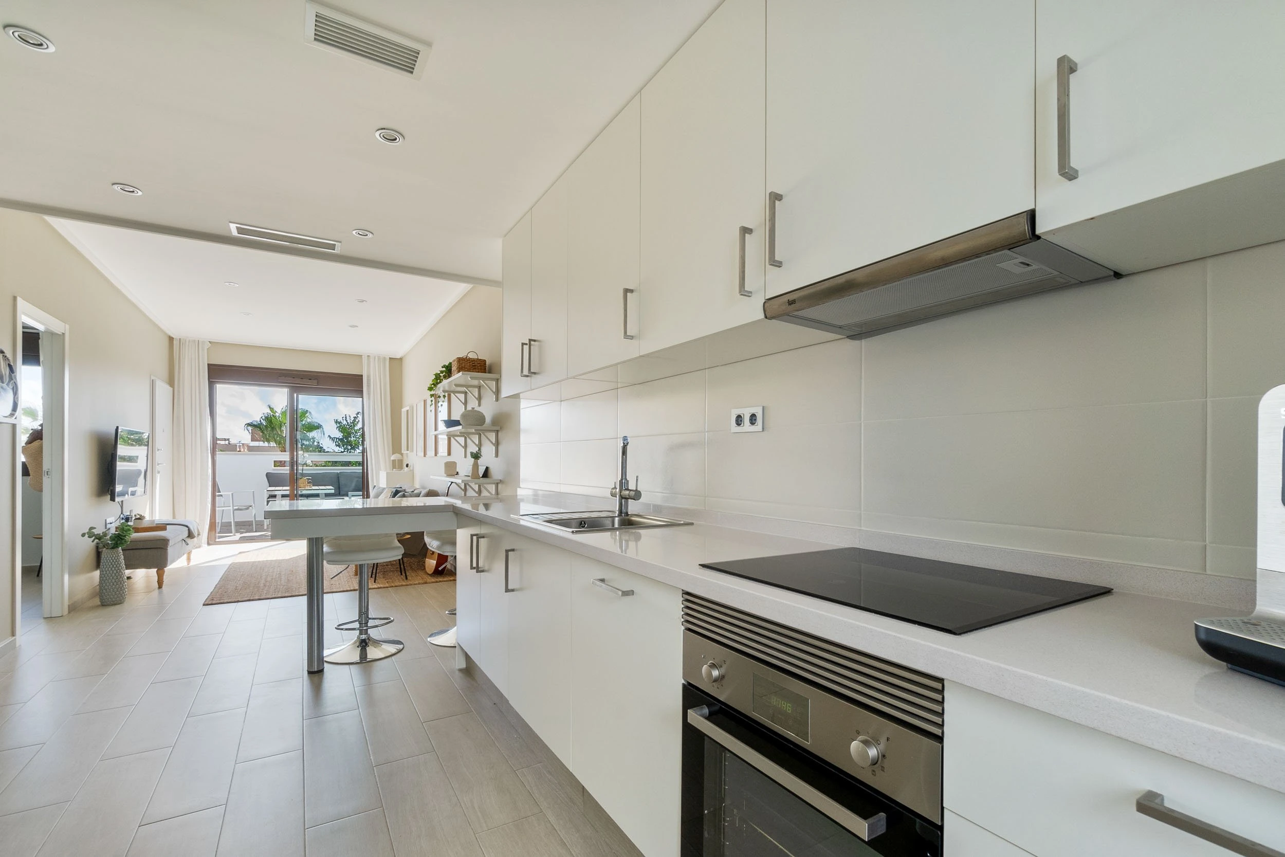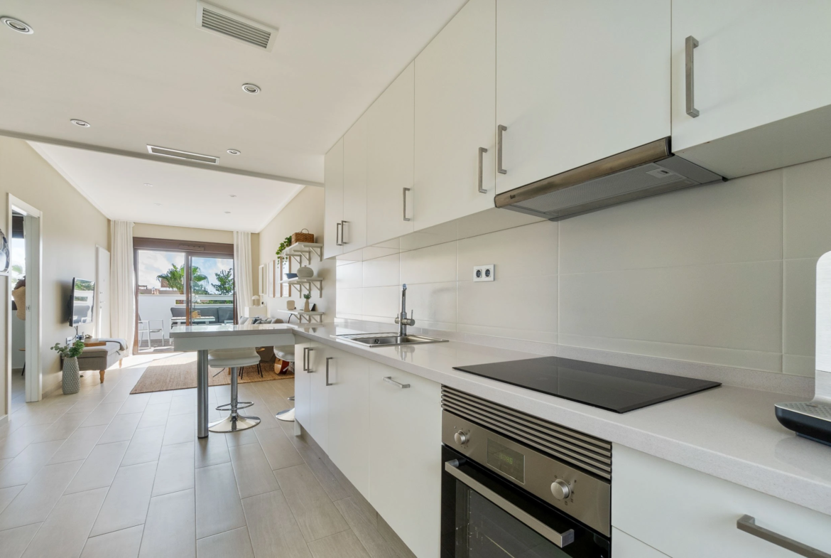 Viduje stilinga atviro plano svetainė atsiveria į modernią virtuvę, sukuriančią šviesią ir jaukią atmosferą. Didelės stiklinės plokštės praleidžia daug dienos šviesos ir suteikia tiesioginę prieigą prie verandos. Virtuvė skoningai dekoruota baltomis spintelių durimis, nerūdijančio plieno prietaisais ir erdvia sandėliavimo vieta – vieta, kur maisto gaminimas ir bendravimas yra neatsiejami.