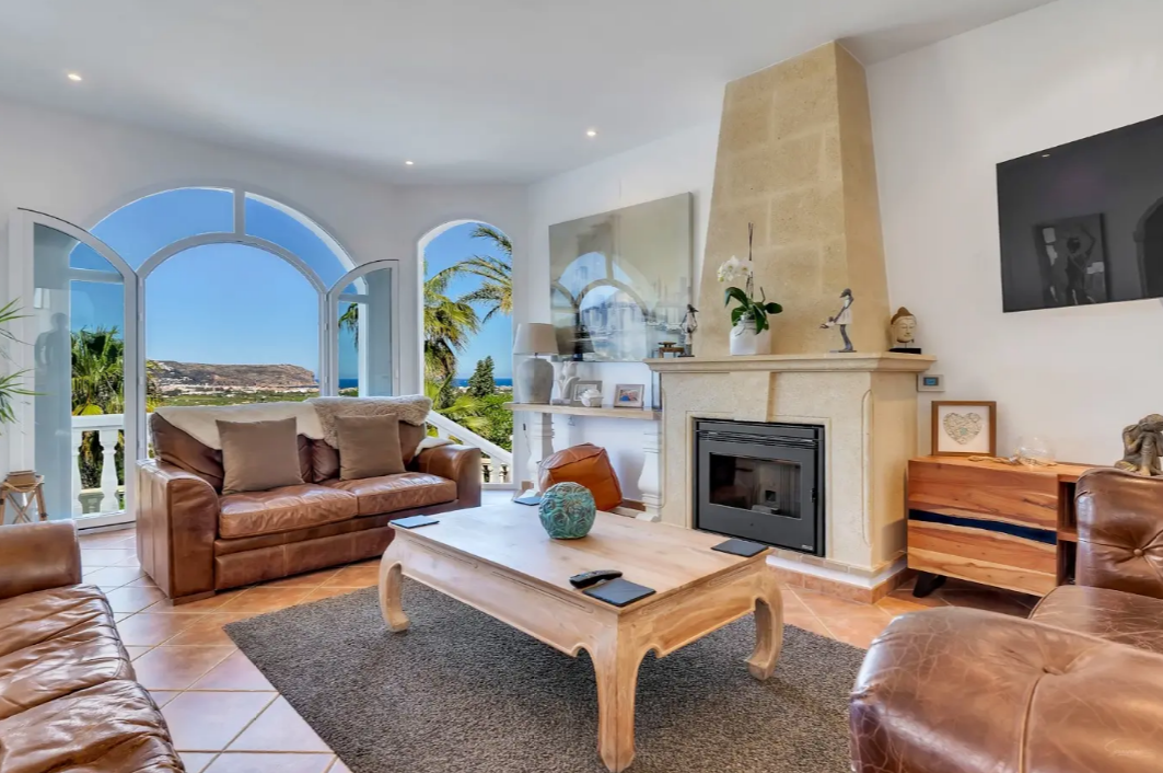 The main living area is bright and inviting, boasting a Tosca stone fireplace and elegant arched features that reflect the villa’s Mediterranean character.