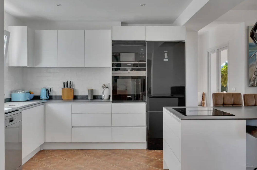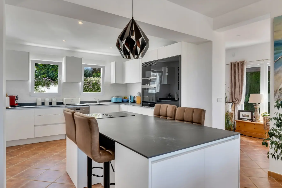 A separate dining area provides a lovely setting for meals with garden and sea views, while the fully equipped kitchen includes a central island and high-quality appliances, ideal for family use or entertaining.
