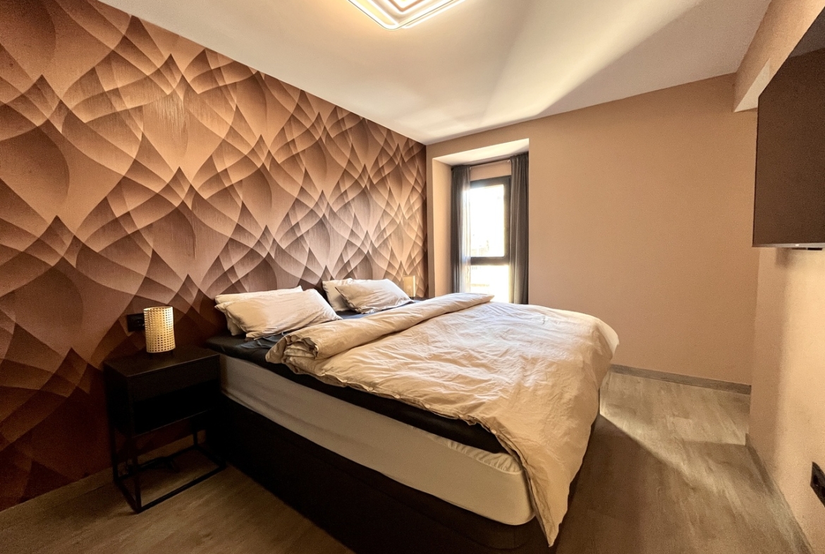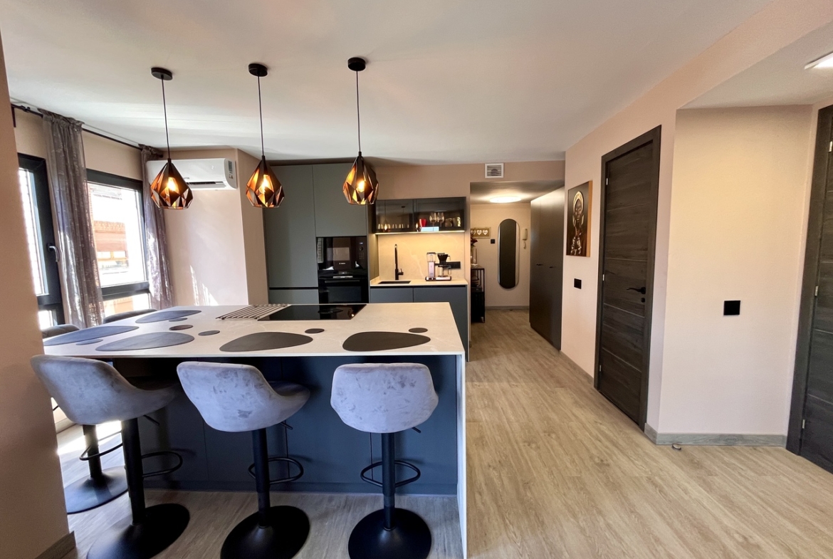 Fully renovated to a high standard, the apartment features a contemporary open-plan kitchen with a central island, waterproof vinyl laminate flooring throughout, and ducted air conditioning. Both bathrooms have underfloor heating, with the master en-suite offering a spacious double rainfall shower.