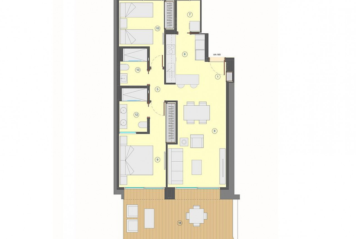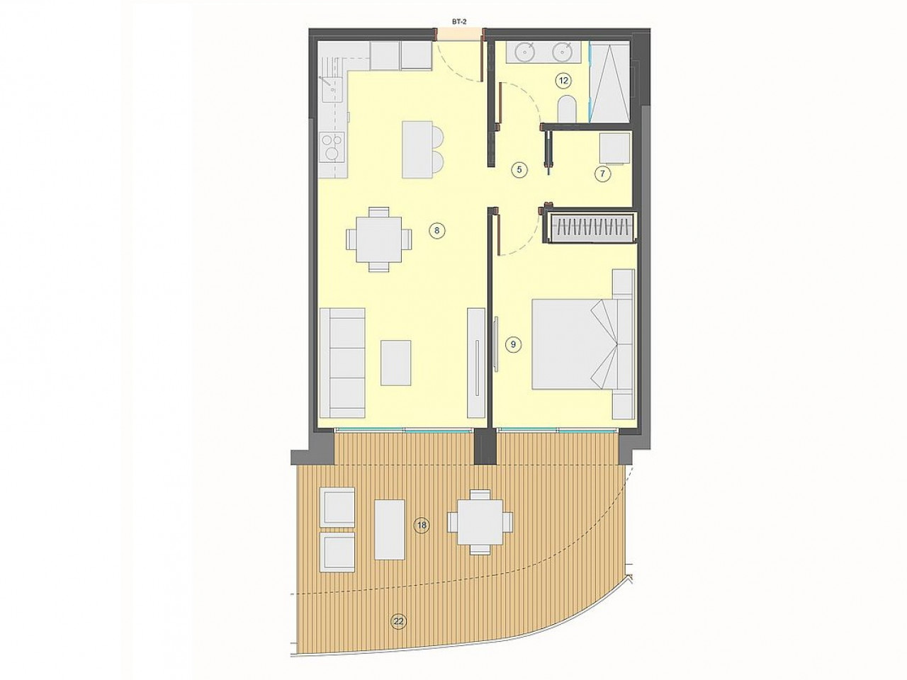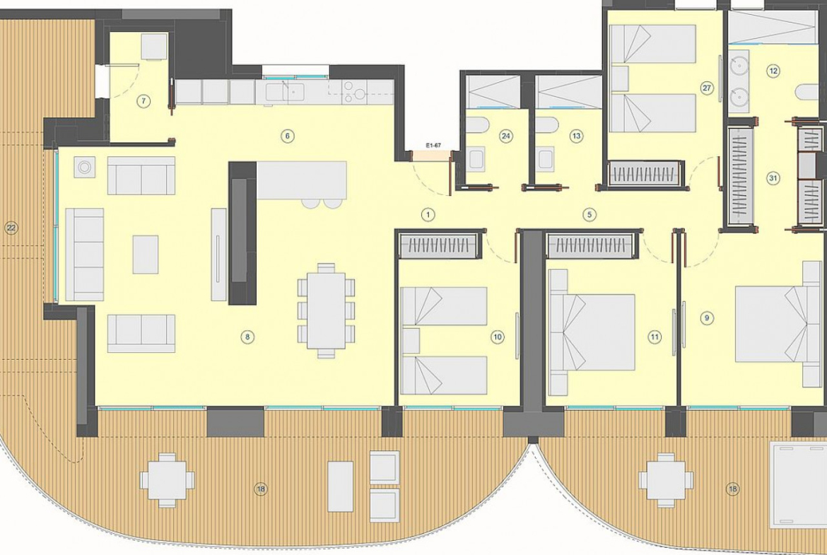 Urbanizacija organizuota dviejose pagrindinėse apželdintose platformose, iš kurių atsiveria atviri jūros vaizdai iš įvairių lygių. Viršutinėje platformoje sutelktos pagrindinės bendros ir socialinės projekto erdvės, įskaitant privažiavimo aikštelę, sveikinimo erdves ir socialines zonas, baseinų zonas suaugusiems, vaikams, šildomą baseiną ir sūkurinę vonią, vaikų žaidimų aikštelę, sporto takelių zoną ir poilsio zoną su gėrimų tiekimu. Urbanizacijoje numatyta didelė lauko dviračių stovėjimo aikštelė, apsupta sodų, ir įvažiavimas į požeminę automobilių stovėjimo aikštelę. Visiems būstams priklauso automobilių stovėjimo vieta pastato rūsyje.