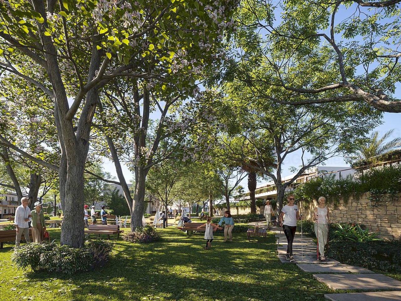 Kompleksas su dideliais žaliaisiais plotais, daugybe komunalinių patalpų (restoranas, sporto salė, medicinos centras…), apsauga ir individualizuotos paslaugos.