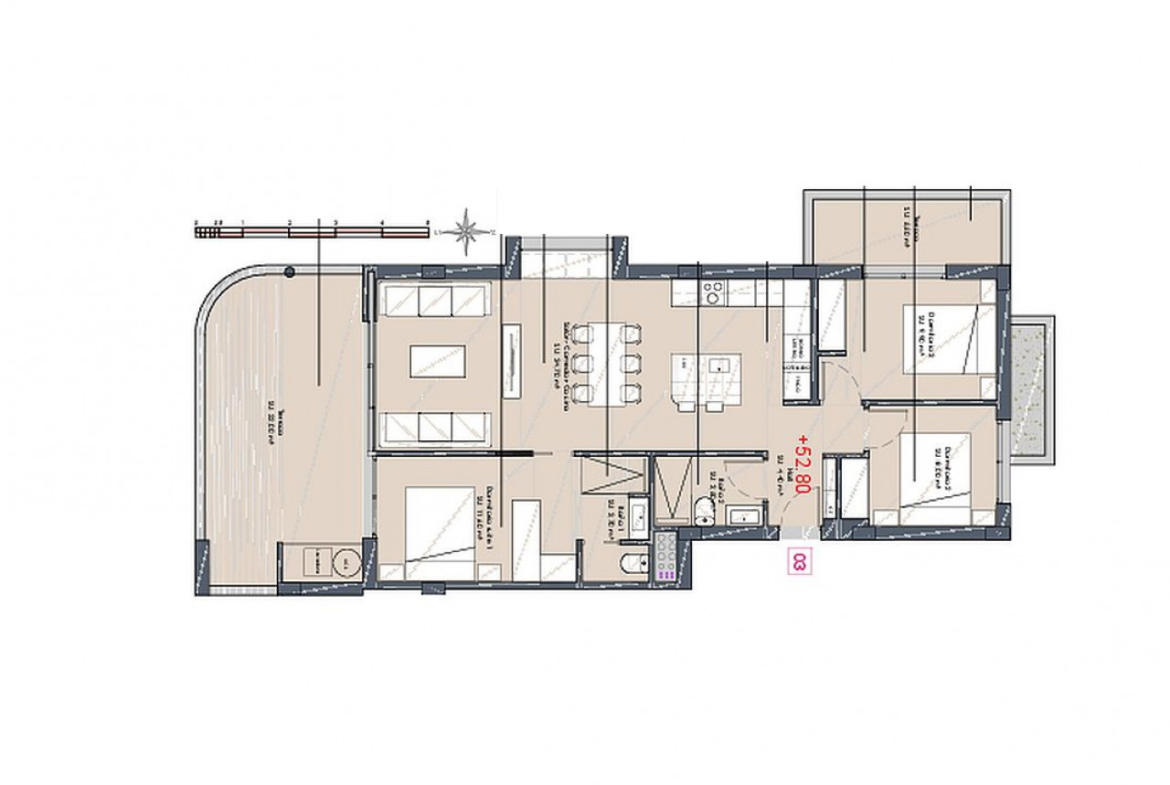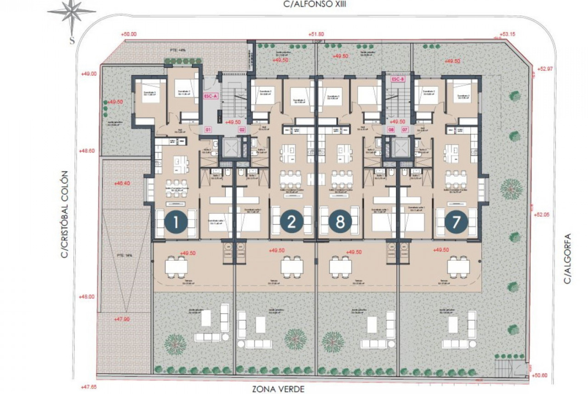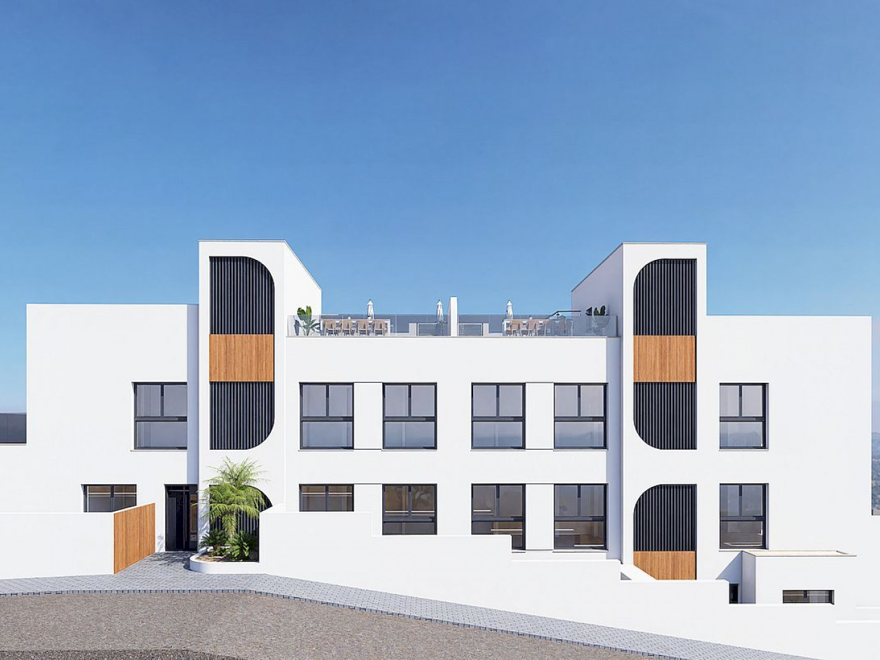 Pastatas, kuriame 4 aukštų, siūlo butus pirmame aukšte su didele sodo zona, viduriniame aukšte su erdviomis terasomis ir viršutiniame aukšte su privačiu soliariumu.
