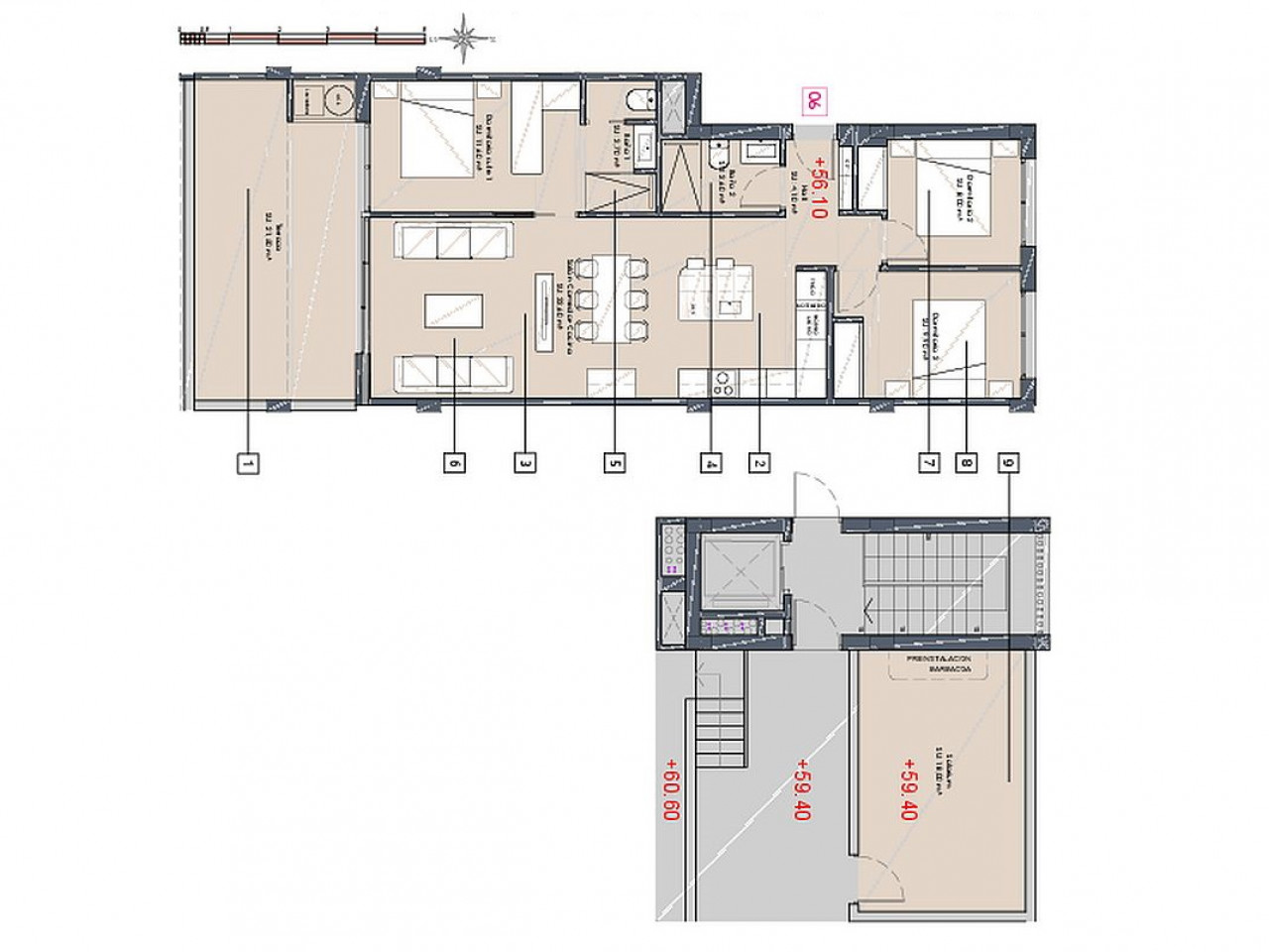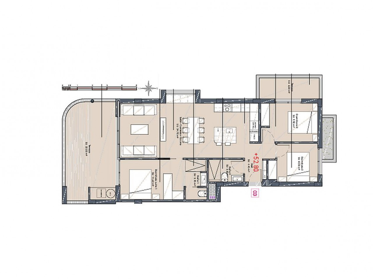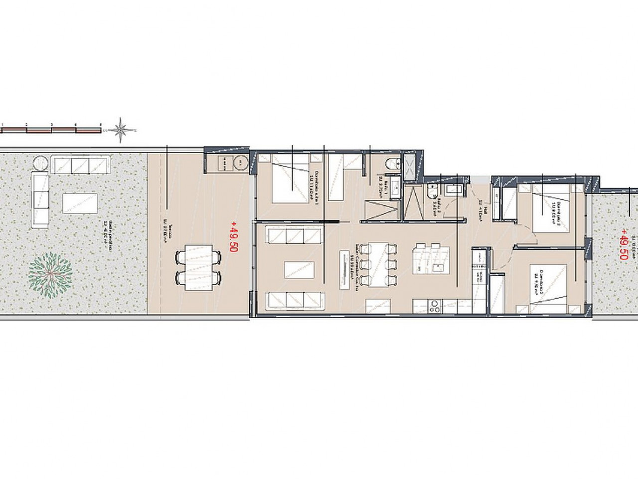Pastatas, kuriame 4 aukštų, siūlo butus pirmame aukšte su didele sodo zona, viduriniame aukšte su erdviomis terasomis ir viršutiniame aukšte su privačiu soliariumu.
