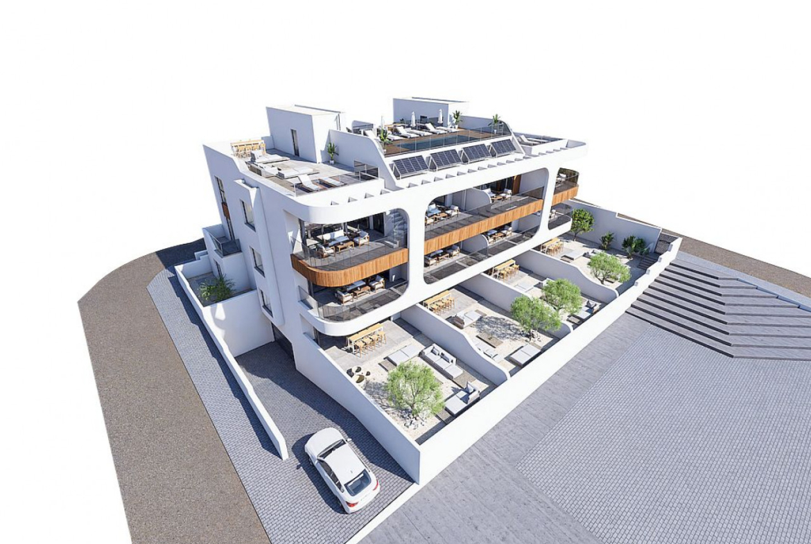 Pastatas, kuriame 4 aukštų, siūlo butus pirmame aukšte su didele sodo zona, viduriniame aukšte su erdviomis terasomis ir viršutiniame aukšte su privačiu soliariumu.