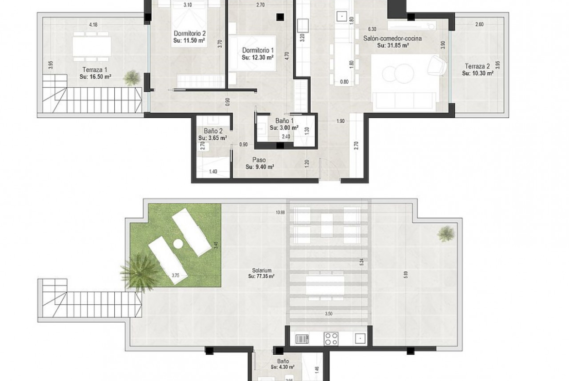 Iš viso kompleksą sudaro 51 butas, išsidėstęs trijuose skirtinguose pastatuose su 2 ir 3 miegamaisiais. Yra įvairių variantų: pirmame aukšte su erdvia terasa ir tiesioginiu išėjimu į bendrą baseiną, apartamentai su terasa ir penthausai su terasa bei privačiu soliariumu ir tualetu, vasaros virtuve ir dirbtine žole soliariume.