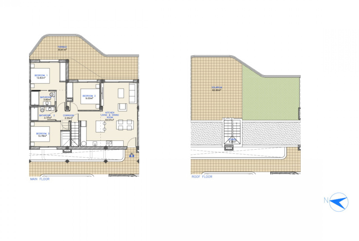 Pirmame ir antrame aukšte esančiuose apartamentuose yra 2 miegamieji, tuo tarpu penthausai yra 3 miegamųjų su privačiu soliariumu ir nuostabiais vaizdais. Taip pat yra požeminė automobilių stovėjimo aikštelė ir sandėliukas.