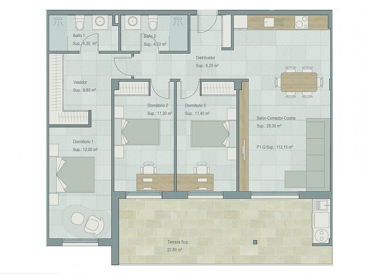Kiekviename bute yra erdvi svetainė su atvira virtuve, du arba trys erdvūs miegamieji su įmontuotomis spintomis ir du vonios kambariai, iš kurių vienas yra vonios kambarys su pagrindiniu miegamuoju ir įspūdinga 14 m2 terasa.
