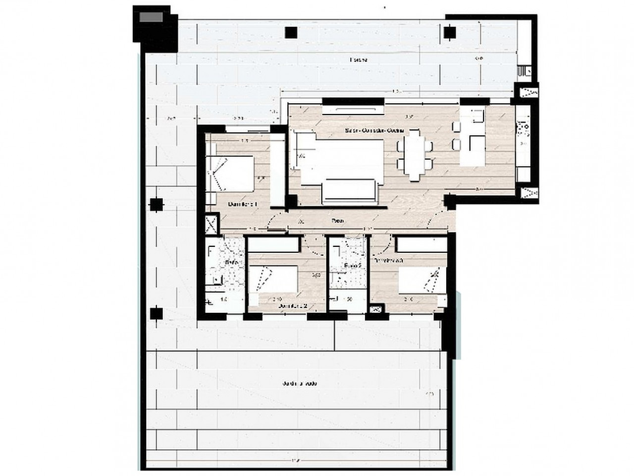 Pirmame aukšte yra komercinis pastatas, o ant komercinių patalpų stogo – įspūdingas baseinas. Į kainą įeina baldai, buitinė technika, patalynė, užuolaidos, virtuvės reikmenys. Pilnai įrengtas oro kondicionierius ir grindinis šildymas vonios kambariuose.