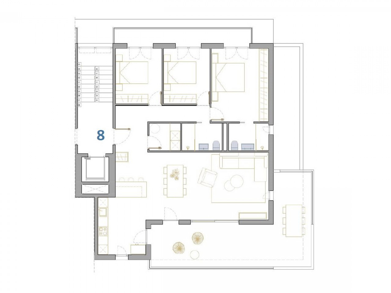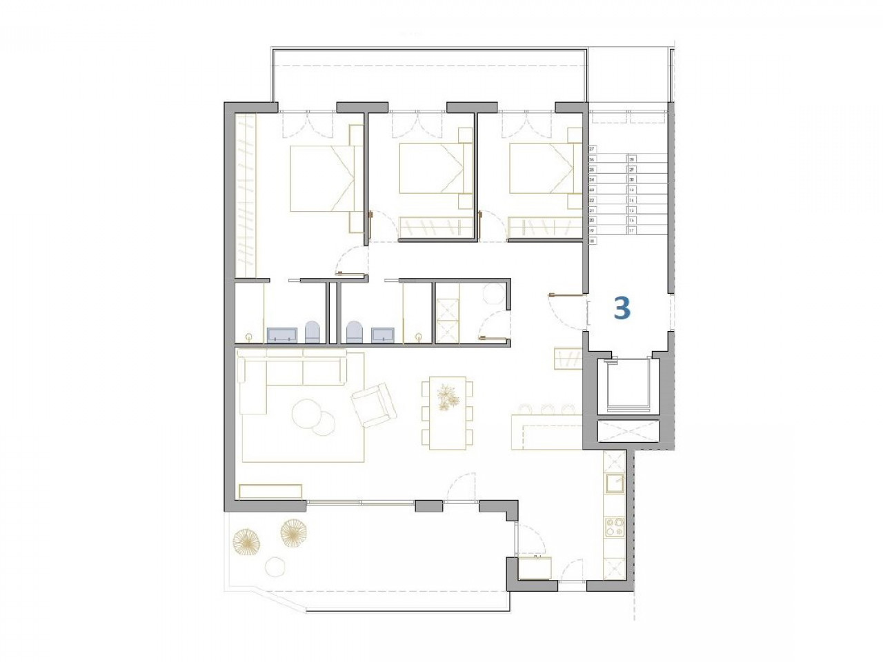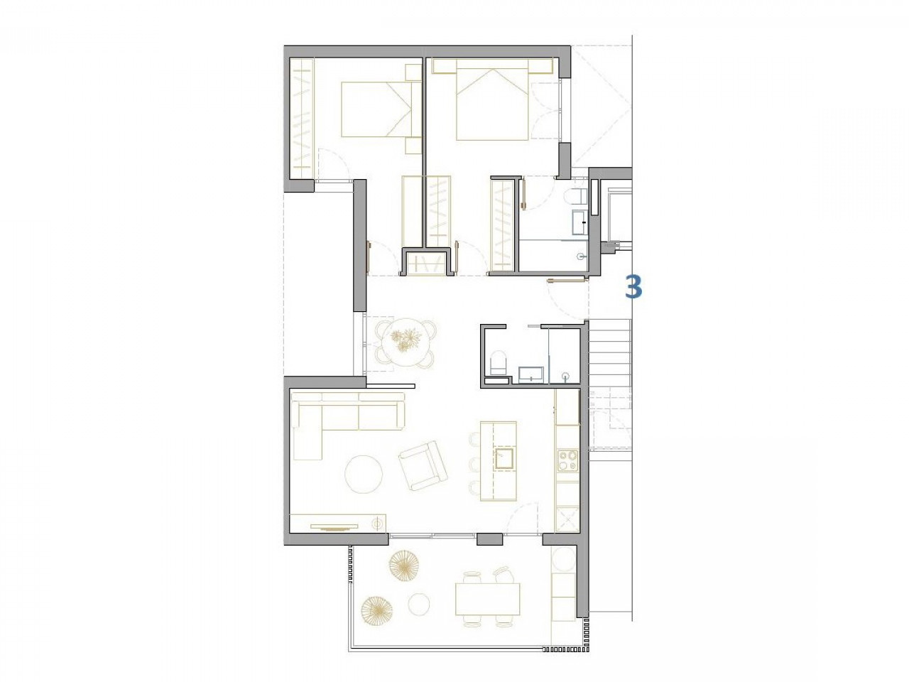 Butai ir penthausai su 2 ir 3 miegamaisiais, 2 vonios kambariais, atviro plano virtuve su svetaine, didelėmis terasomis, įmontuotomis spintomis, pilnai įrengtais vonios kambariais, terasomis. Pirmame aukšte esantys apartamentai turi privatų sodą, o viršutiniame aukšte esančiuose penthausuosr yra privatus soliariumas. Kiekvienam būstui priklauso požeminė automobilių stovėjimo aikštelė su sandėliuku.