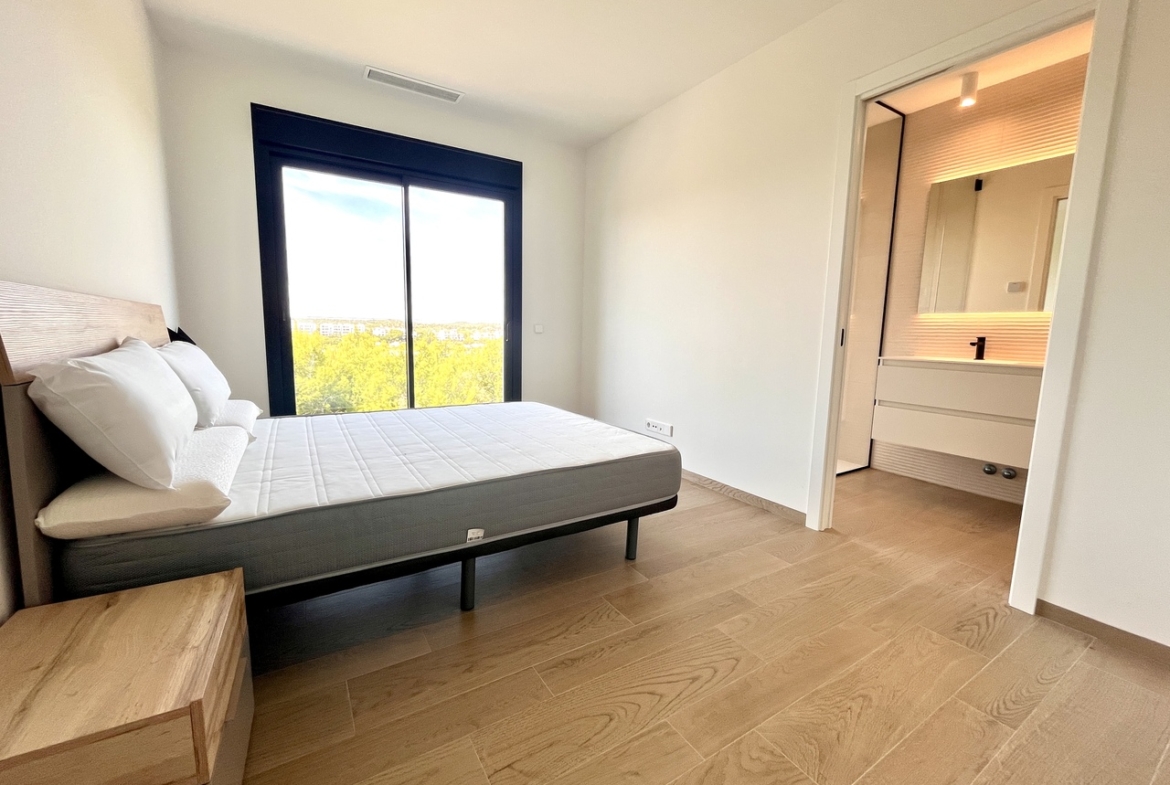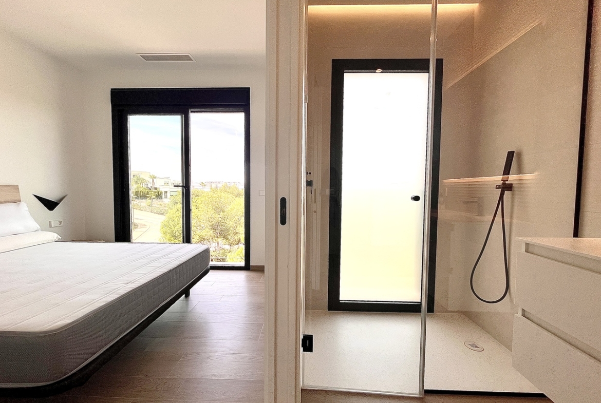 Super modern 2nd floor apartment for sale on sought after Las Colinas Golf resort. This huge apartment has 2 very large bedrooms both with en-suite bathrooms along with a 3rd guest toilet. Their is a fully integrated and slick open-plan kitchen leading into the very wide living and dining room. There is a mega balcony with the most stunning sea views, golf course views and looks down over the manicured gardens and swimming pool. The property is sold as seen, with many extras including underground parking and storage and already has a rental license.