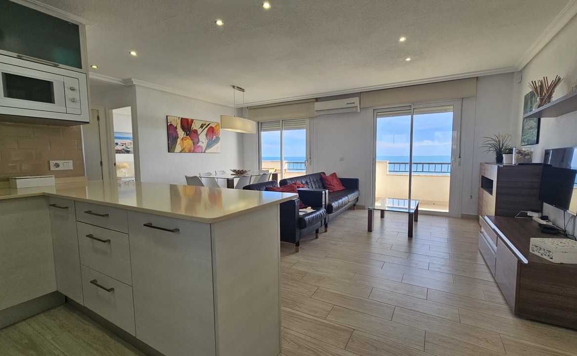FRONTLINE, STUNNING SEA VIEWS! We are proud to present a beautiful, renovated frontline apartment located in Mil Palmeras, renowned as one of the finest beaches on the coast. The apartment is located on the second-floor, features three bedrooms, two bathrooms, and a bright, open living/dining area, and a fully fitted kitchen. The livingroom area opens onto a large terrace, offering beautiful views of the sea. The property comes fully furnished and includes air conditioning and elevator access. It is located within a secure, enclosed community to ensure privacy. Included with the property are two private parking spaces, one in the community garage and one in the outdoor parking area. And it also has a valid tourist rental license. This property is a must see and are hard to find in the area. The area offers a vibrant strip for dining, a lot of restaurants ,bars, beach bars, shops and more. Mil Palmeras is known for its beautiful beaches, clear waters and is considered one of the best in the Orihuela costa coastline.