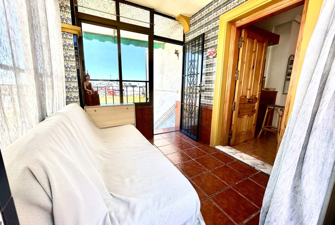 Upstairs, the main living area is bright and inviting, featuring a closed-in conservatory that creates a versatile additional living or dining space for year-round use. From here, you step out onto the south-facing sunny terrace, ideal for enjoying the sun throughout the day and making the most of the Mediterranean climate.