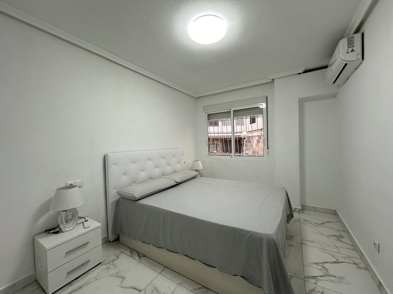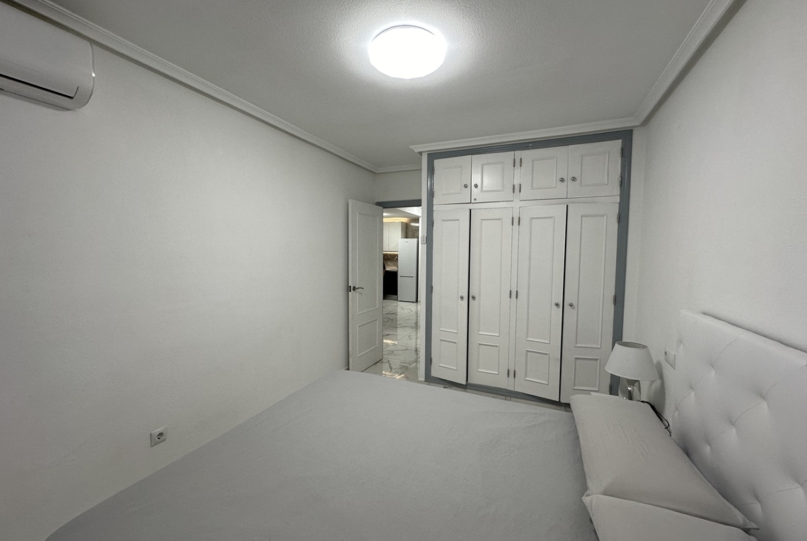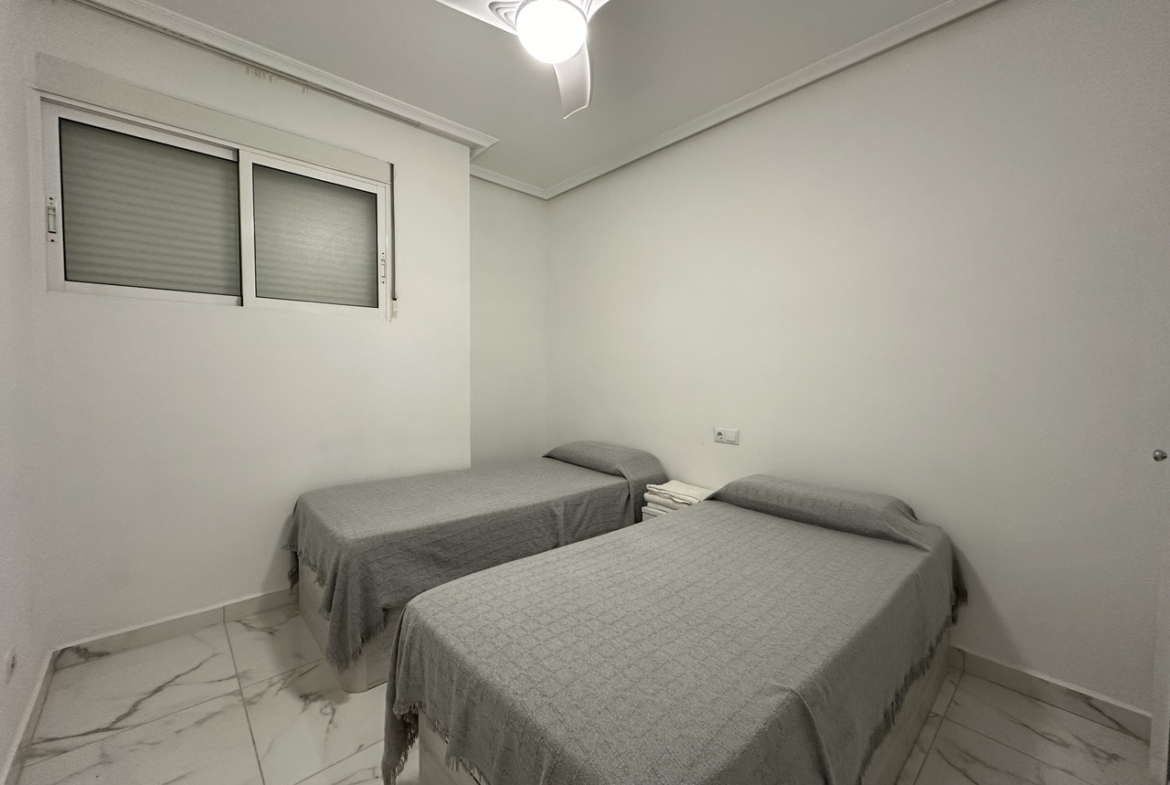 PRIME LOCATION 50m from Playa del Cura, Torrevieja beach is this elevated ground floor apartment. This fabulous 2 bedroom, 2 bathroom apartment has been reformed throughout with a brand new fully equipped kitchen along with 2 stylish bathrooms. The apartment has a huge living and dining room with access to a private glazed terrace with views down to the beach front. The property has two big bedrooms both with fitted wardrobes. The property has been tastefully reformed with modern floor tiling and is sold fully furnished and finished with air-conditioning. The property forms part of a very well maintained private complex where home owners have access to the communal showers and changing rooms to make it easy to wash-off the sand from the beach.