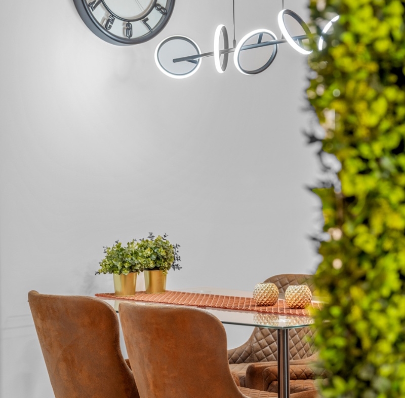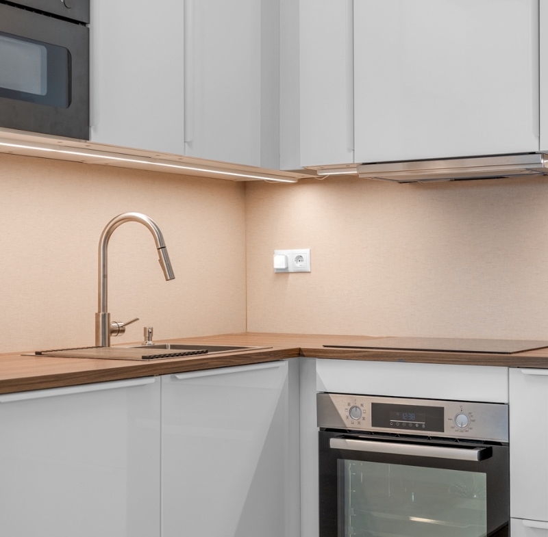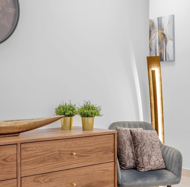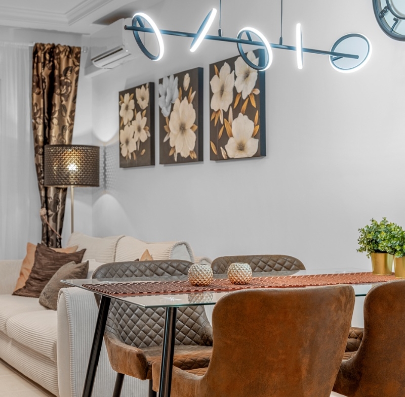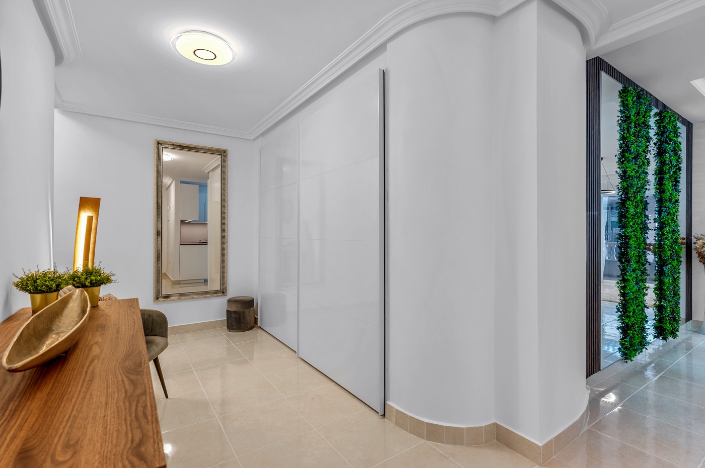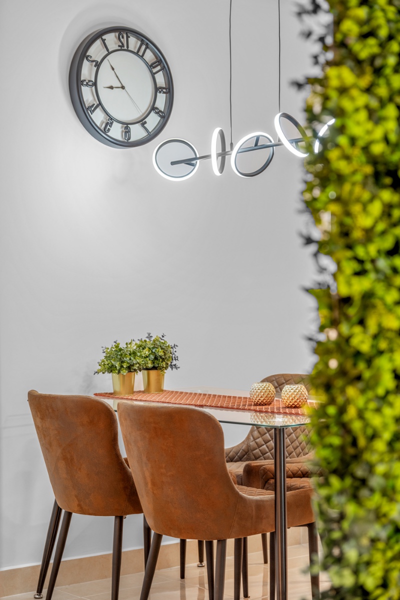 The interior is finished in a modern, minimalist style, blending elegant white tones with warm wood and touches of natural greenery. The apartment is sold partially furnished, as shown in the photos, leaving room for the new owner to personalize the space to their own taste.