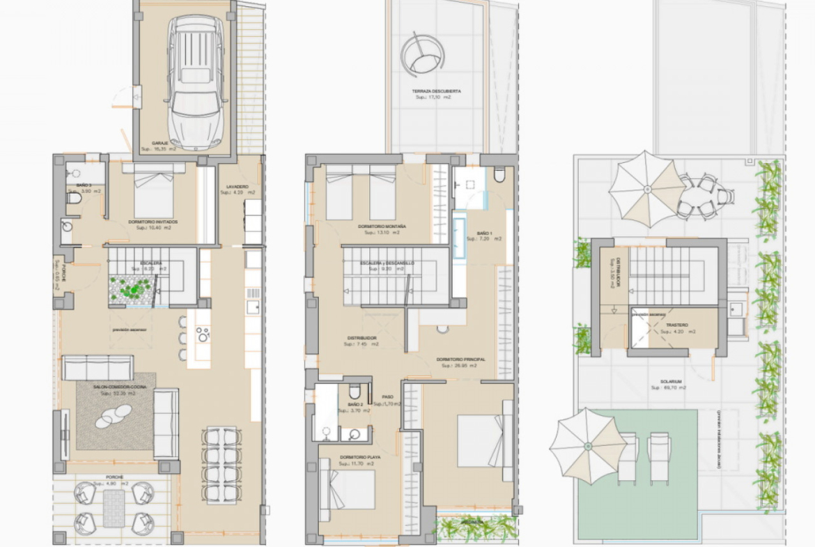 Kiekvienoje viloje yra 4 miegamieji ir 3 vonios kambariai erdviuose, daugiau nei 300 m² ploto sklypuose. Pirmame aukšte yra privatus uždaras garažas, skalbykla, erdvi svetainė su atviro plano virtuve, tiesioginė prieiga prie dengtos verandos ir gražiai sutvarkytas priekinis sodas su begalybės baseinu, iš kurio atsiveria vaizdas į jūrą. Šiame aukšte taip pat yra vienas miegamasis ir vienas vonios kambarys, idealiai tinkantis svečiams arba lanksčiam gyvenimui.