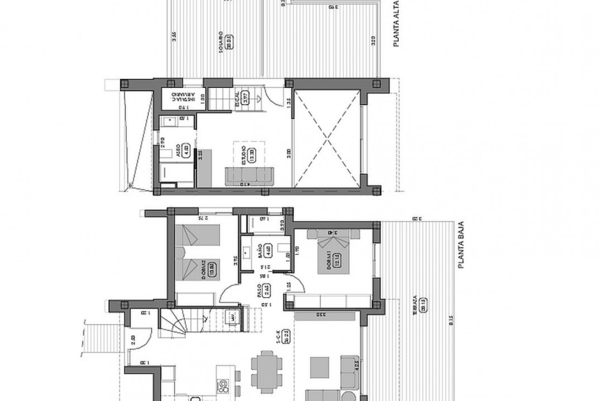 Viršutiniame aukšte yra pagrindinis miegamasis su įmontuotomis spintomis, vonios kambarys ir didelė terasa.