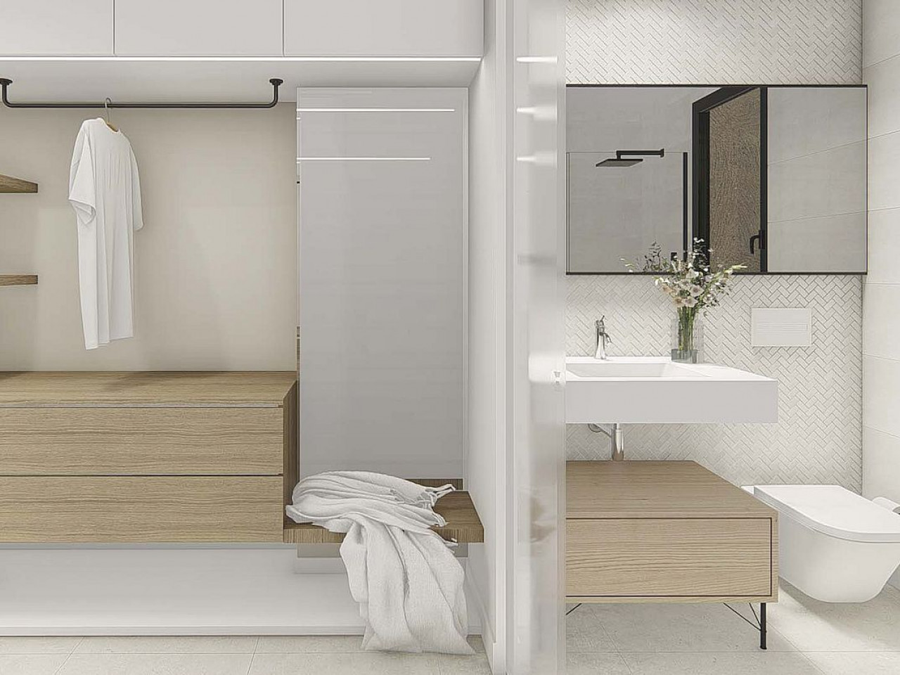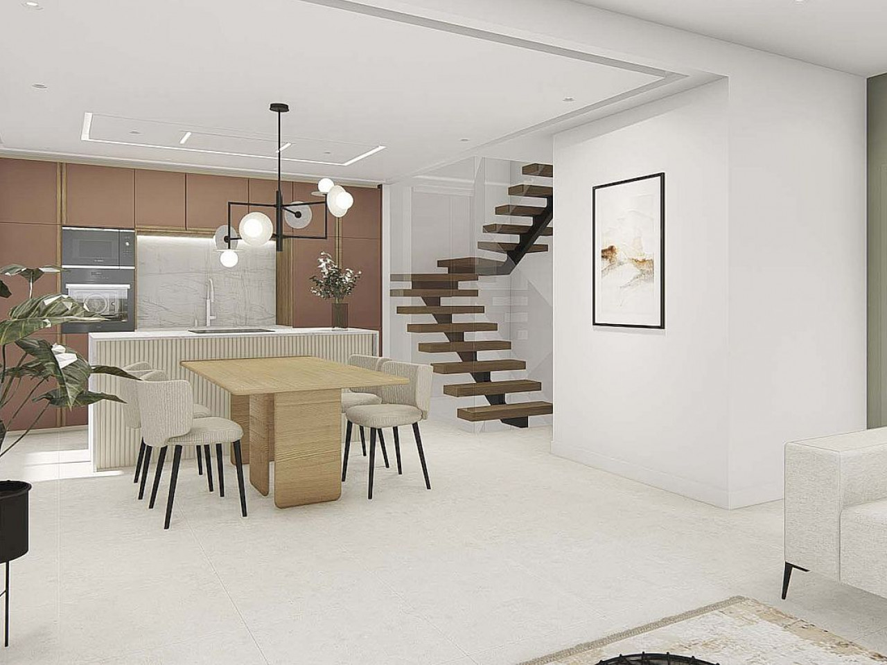 Pirmame aukšte rasite erdvią svetainę su integruota virtuve, svečių tualetą ir pagrindinį miegamąjį su erdvia rūbine bei vonios kambariu.