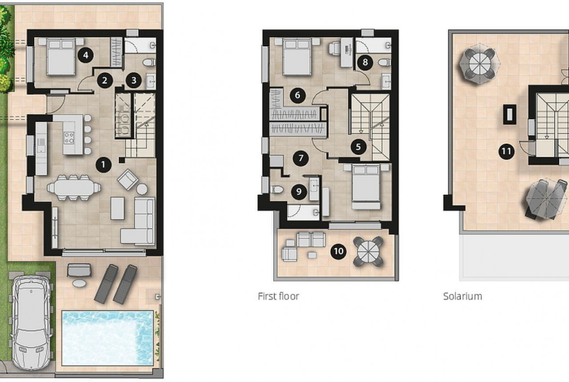 Erdvūs 150 m2 namai, 170 m2 sklypuose ir sublokuoti du po du, paskirstyti po tris miegamuosius, tris vonios kambarius, svetainę, virtuvę-valgomąjį ir privatų baseiną. Namai yra sublokuoti, tačiau vienas nuo kito nepriklausomos konstrukcijos.