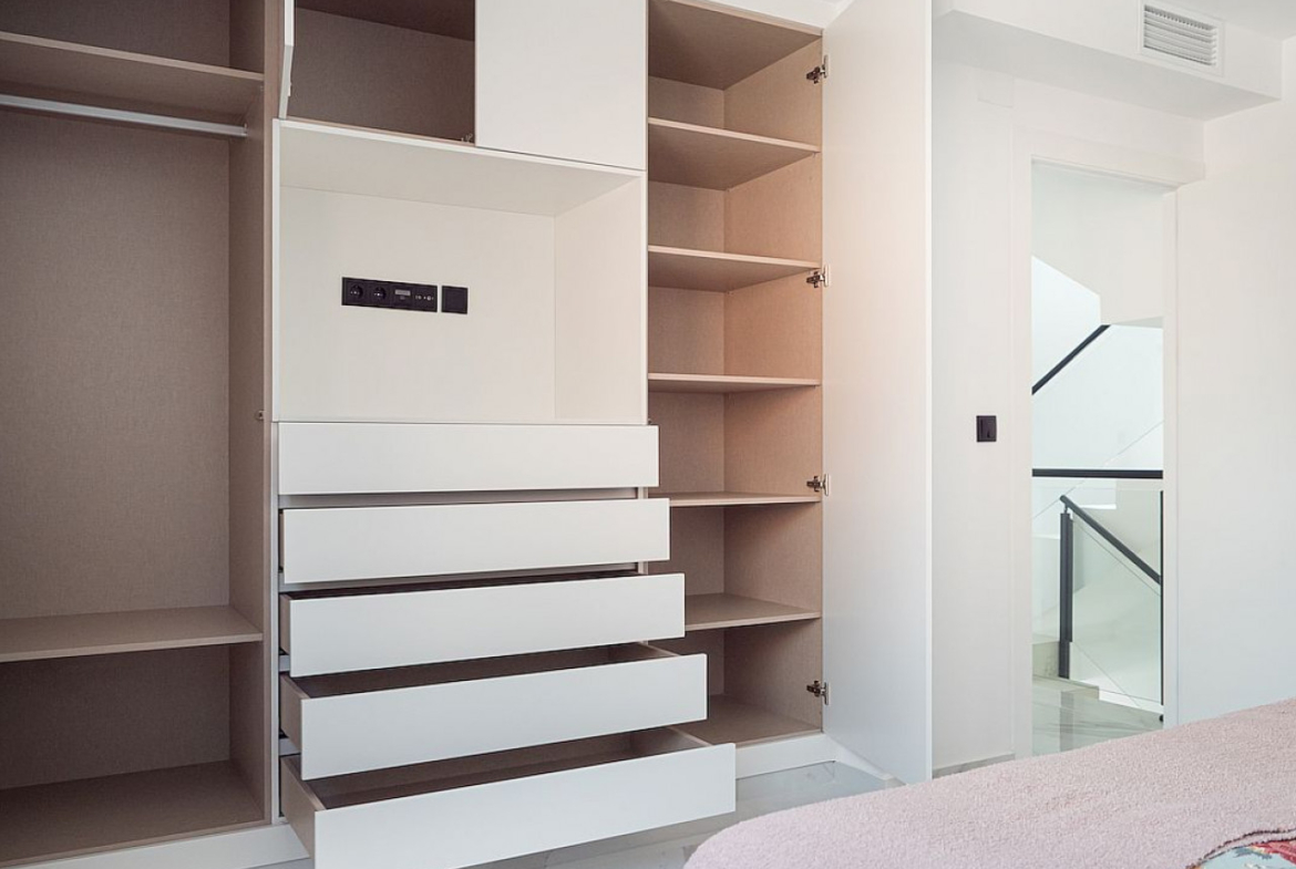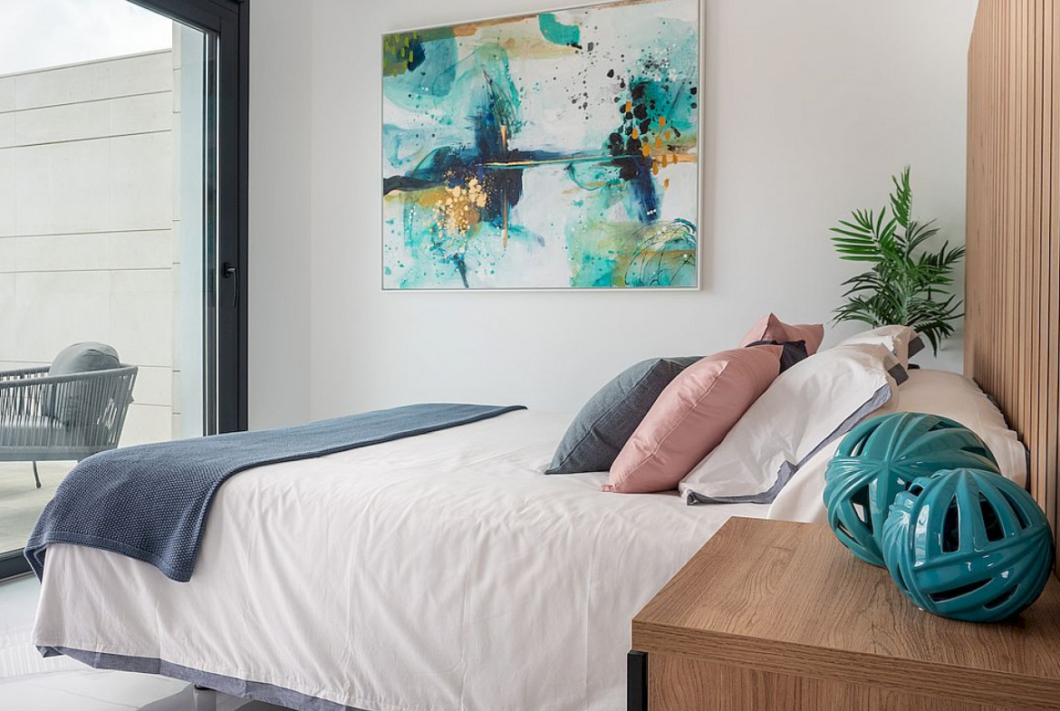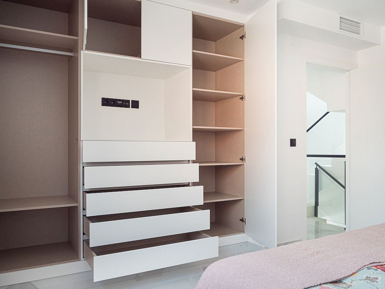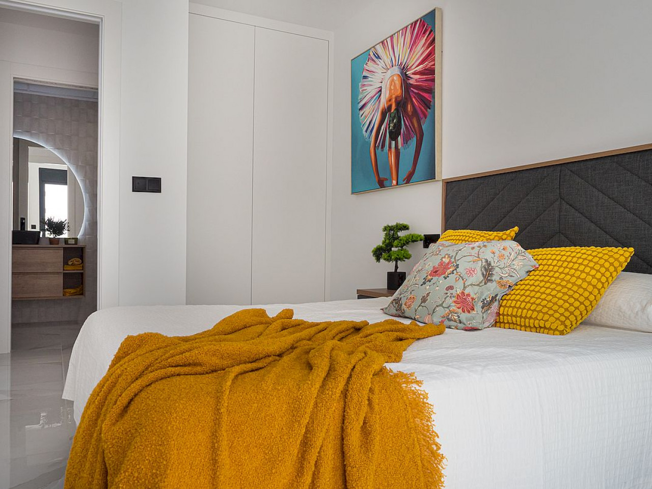 Antrame aukšte yra du miegamieji su įmontuotomis spintomis ir vonios kambariai. Pagrindiniame miegamajame yra drabužinė ir išėjimas į saulėtą terasą su vieta terasos baldams.