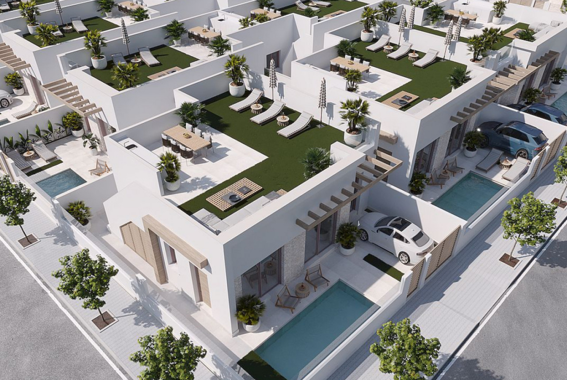 Naujas 11 išskirtinių sublokuotų vilų kompleksas ramiame Mursijos miestelyje Roldan (Torre Pacheco), žemės ūkio, ramybės, sveikos ir tipiškos ispaniškos aplinkos žemėje.