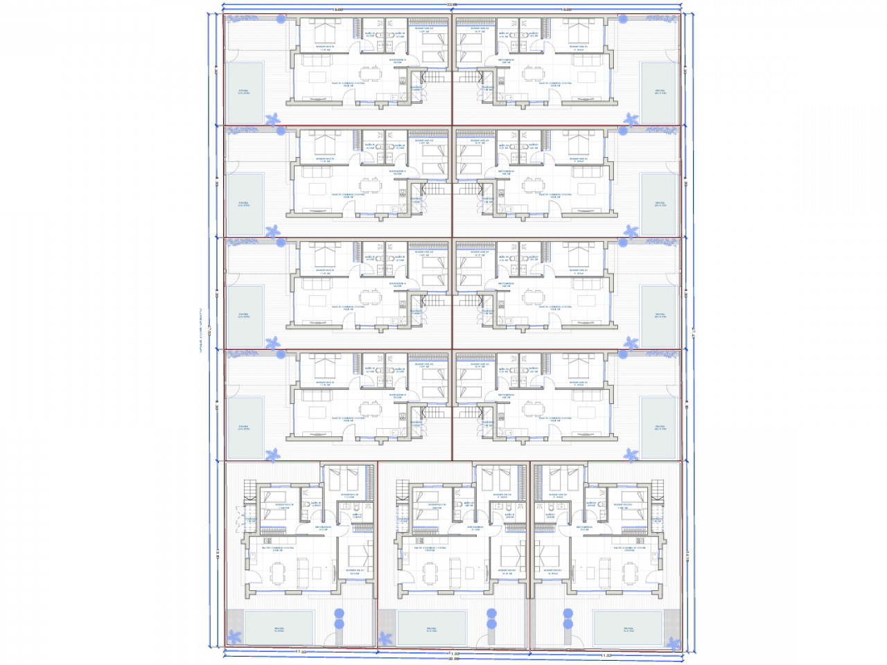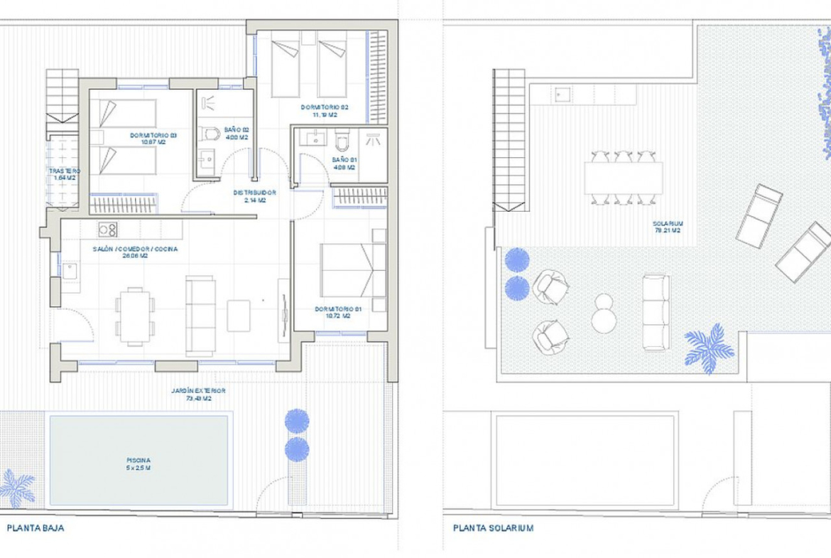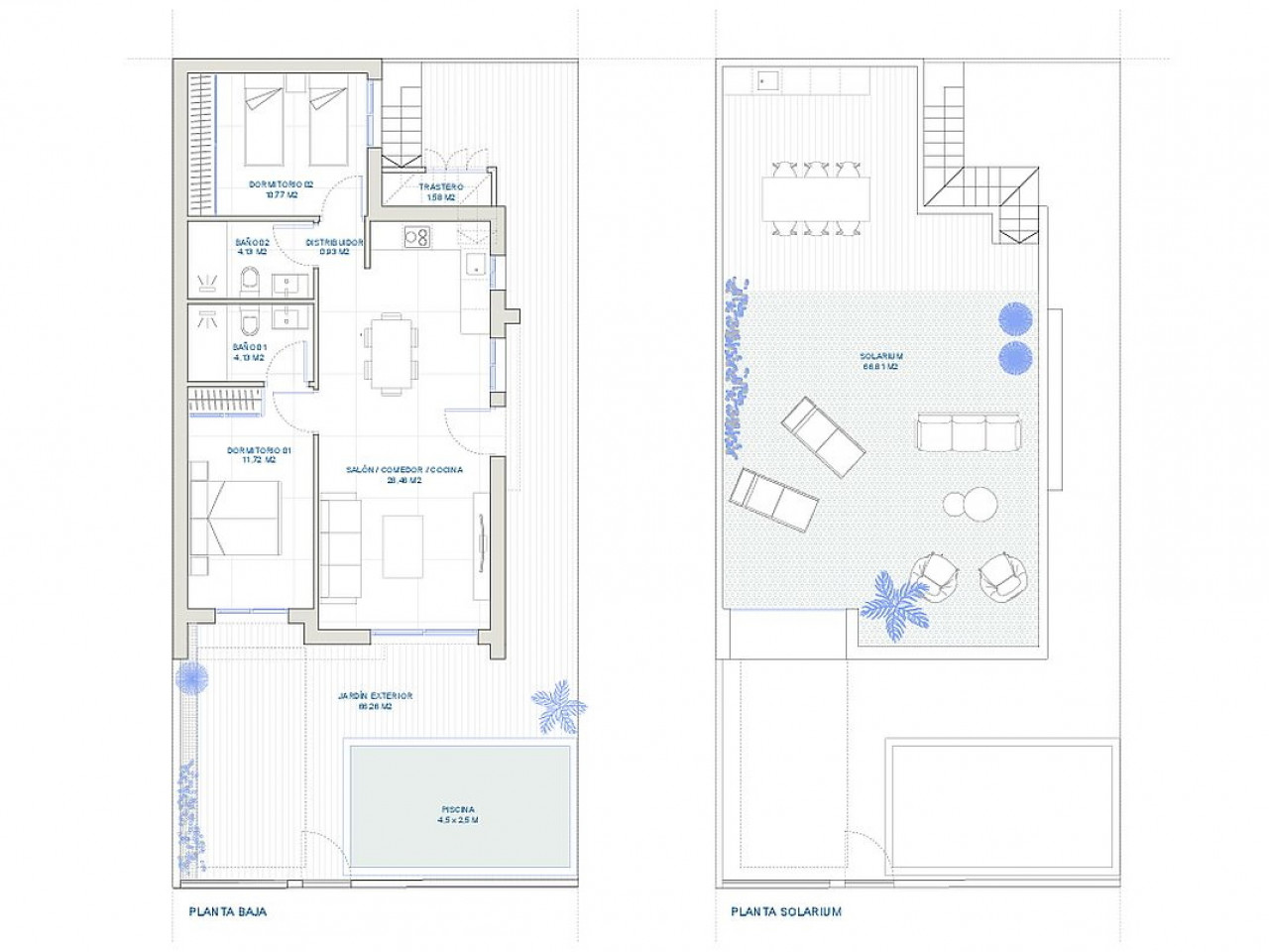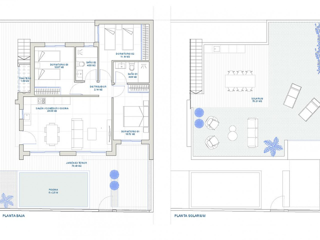Vilos su 2 arba 3 miegamaisiais ir 2 vonios kambariais, sodu, automobilių stovėjimo aikštele, soliariumu ir privačiu baseinu turės sklypo plotą nuo 140 m2 iki 159 m2. Vilų plotai nuo 74,72 m2 iki 85 m2, o baseinų dydis apytiksliai 4,5 m x 2,5 m.