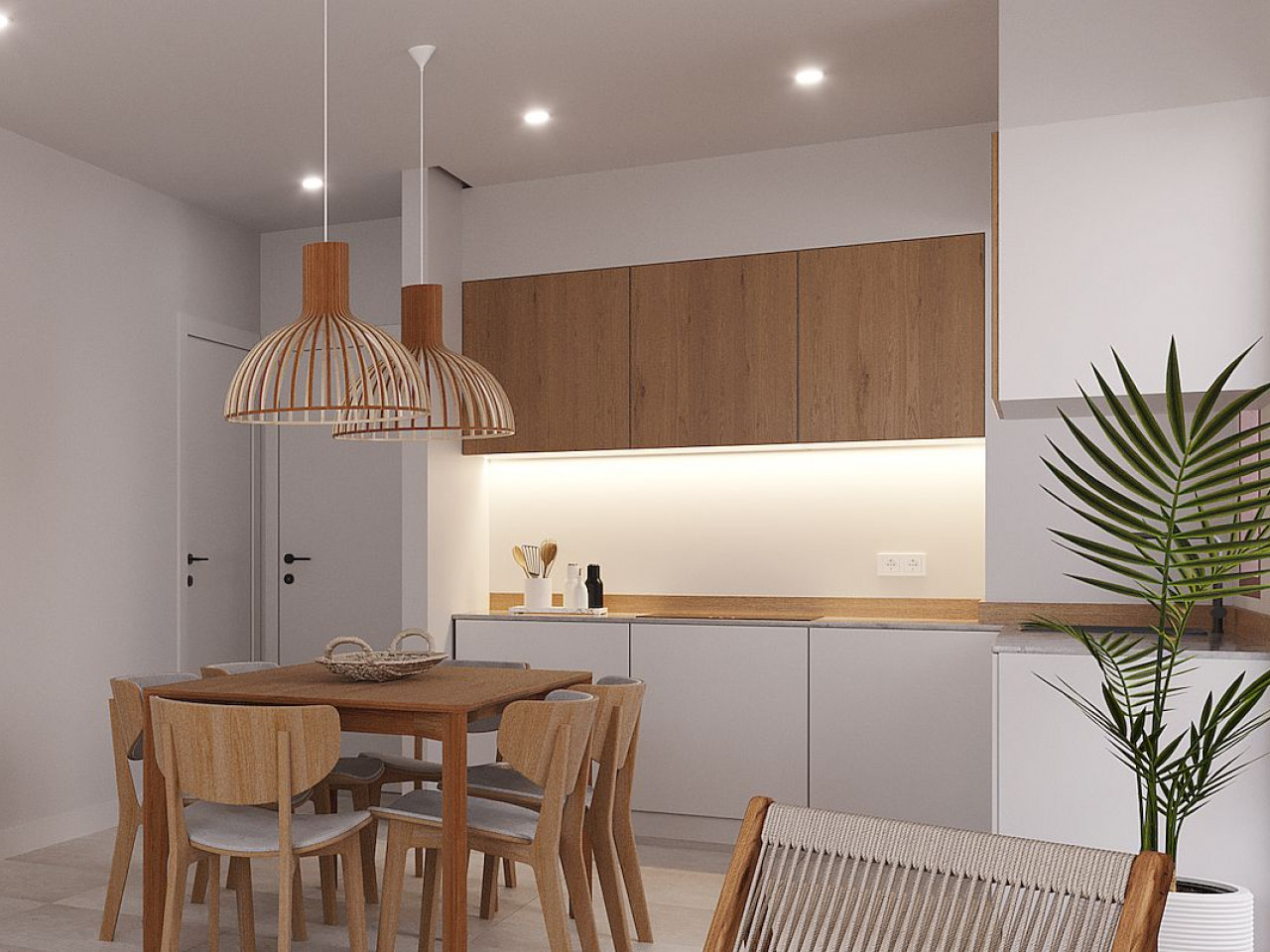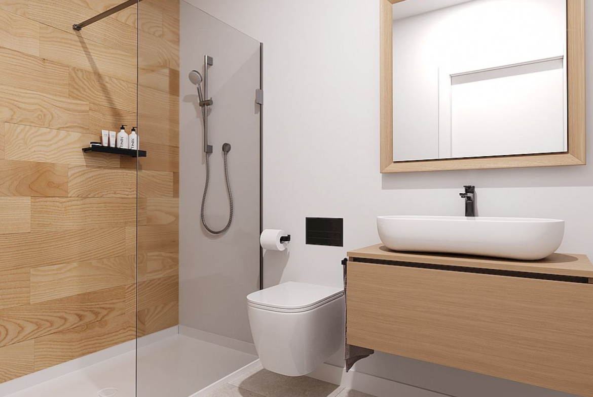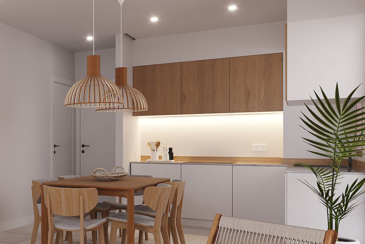 Virtuvės bus pilnai įrengtos, baltos spalvos derinamos su medžio imitacija. Į kainą įeina yra šaldytuvas, orkaitė, integruota indaplovė, keraminė kaitlentė ir gartraukis. Vonios kambariai sukomplektuoti su vonios baldais, veidrodžiu, apšvietimu ir dušo sienele.