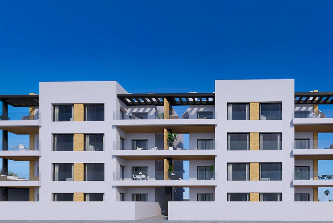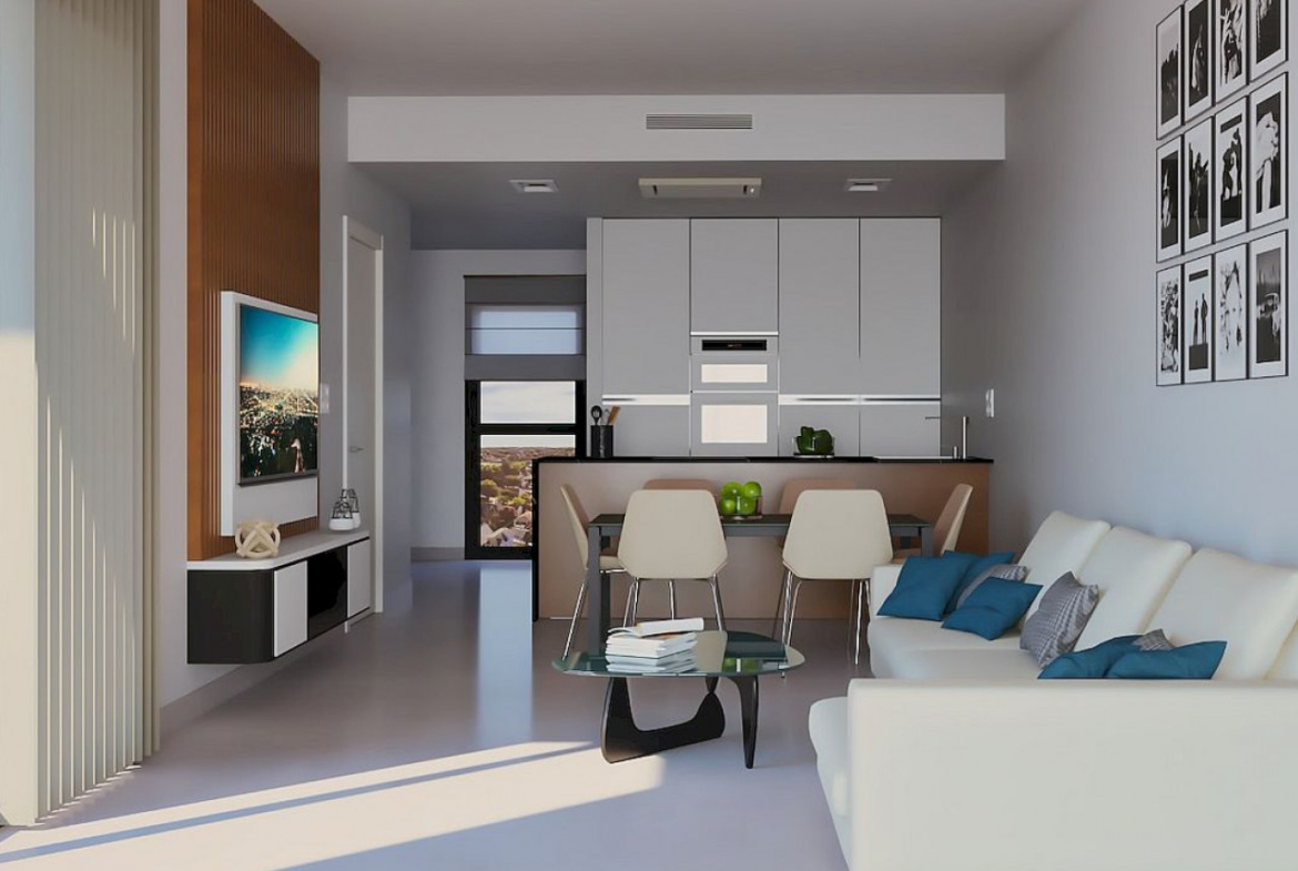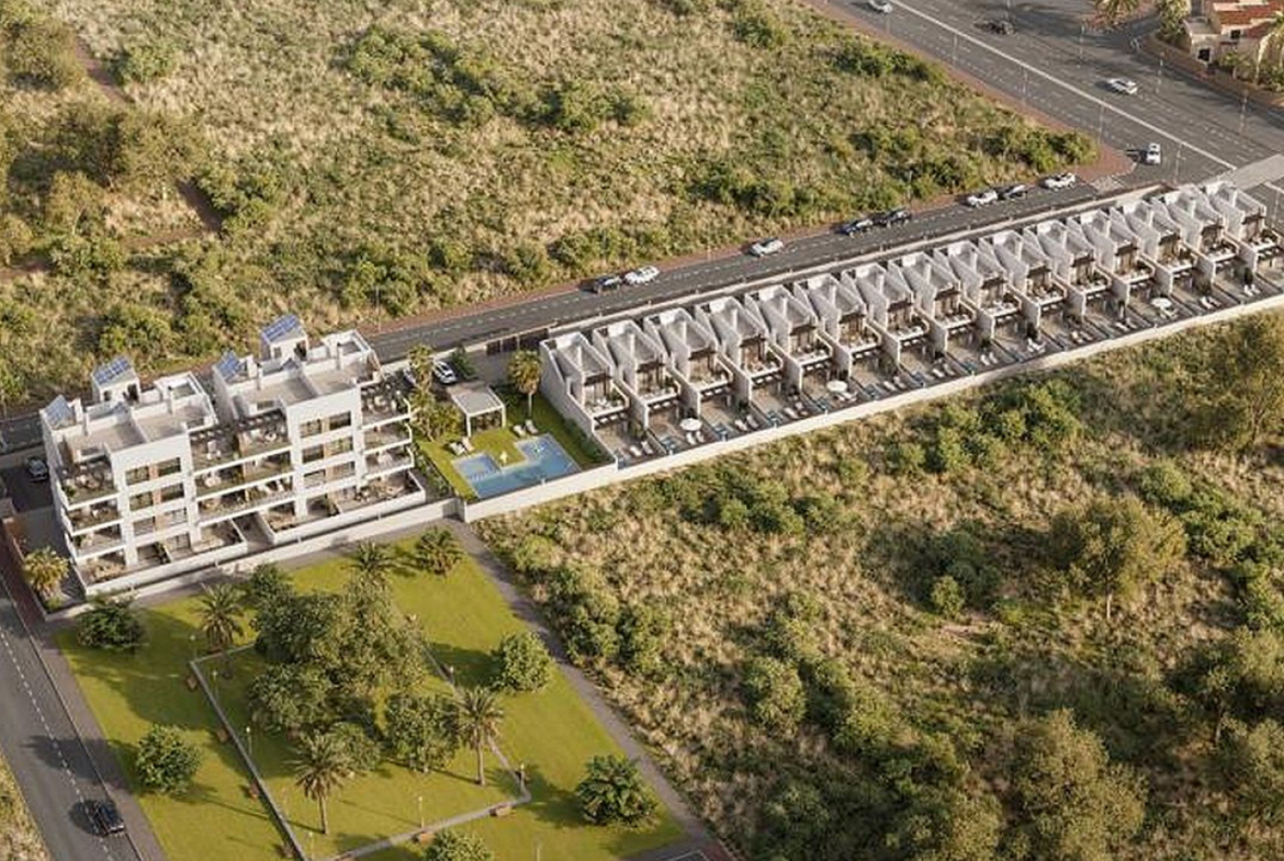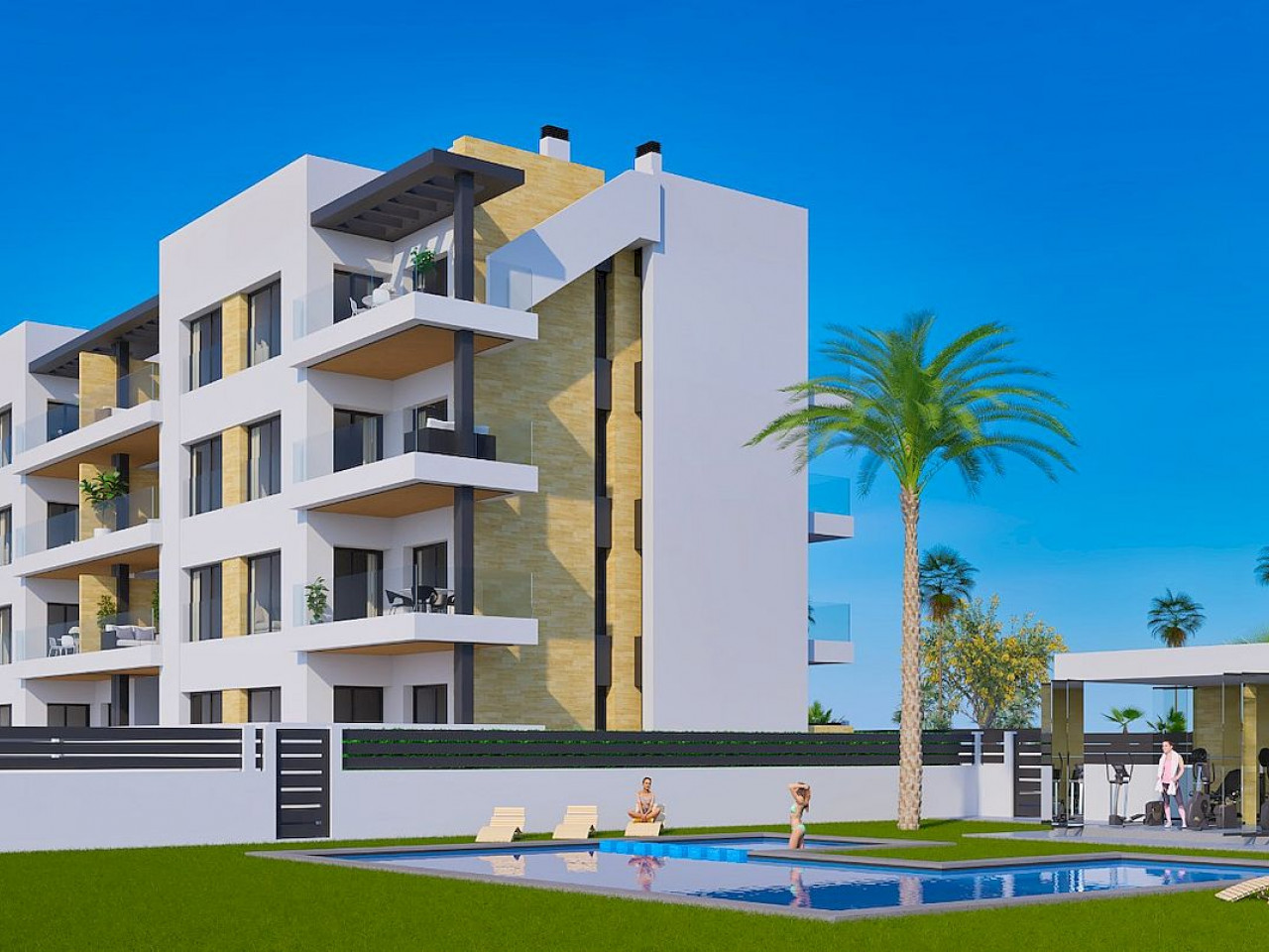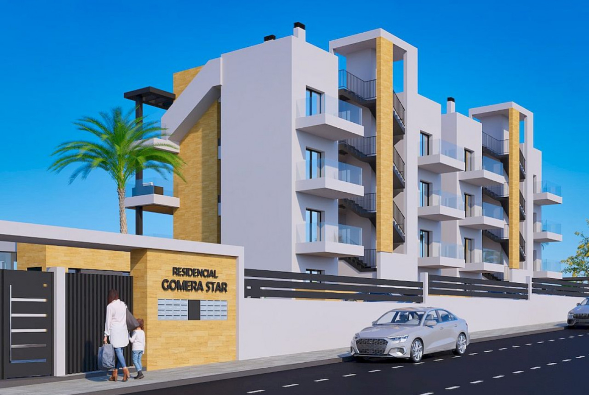 „Gomera Star“ – naujas modernių dviejų miegamųjų apartamentų su erdviomis terasomis, šalia jūros esantis kompleksas gyvybingame Aguas Nuevas rajone, Torrevieja mieste.