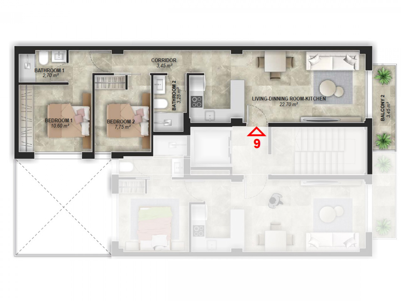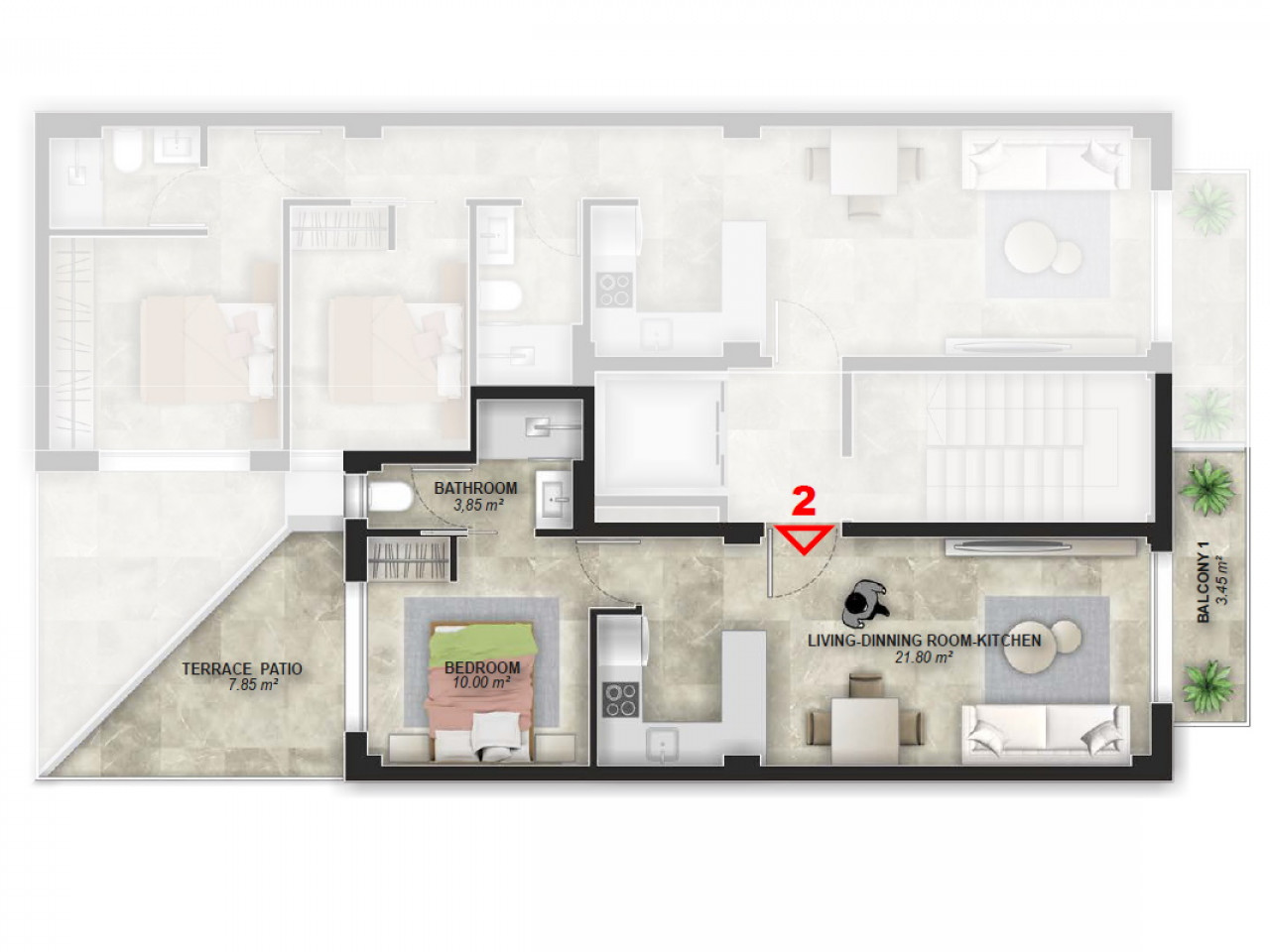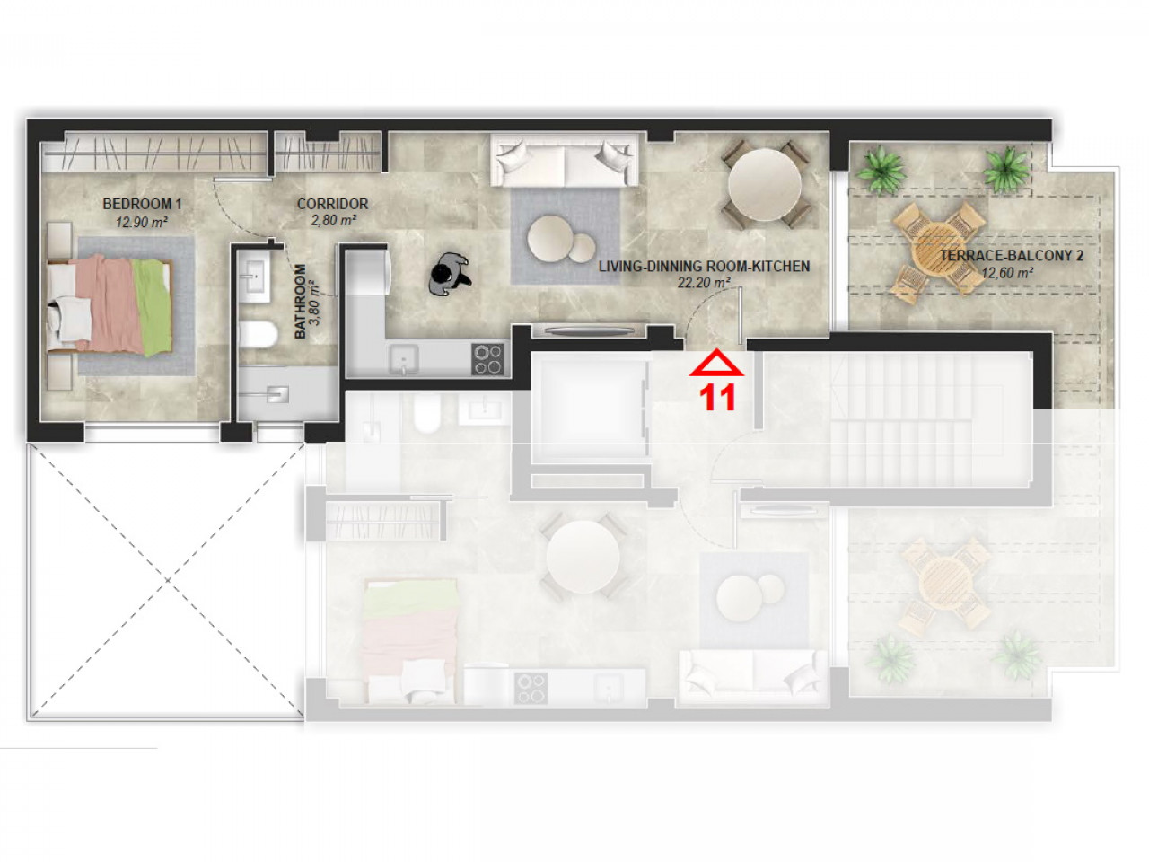 Kompleksą sudaro studijos, vieno miegamojo ir dviejų miegamųjų apartamentai su atitinkamai vienu ir dviem vonios kambariais. Jie idealiai tinka ne tik atostogų nuomai, bet ir gyvenimui ištisus metus. Kiekvienas butas pilnai įrengtas ir paruoštas įsikelti, įskaitant sandėliavimo patalpą pirmame pastato aukšte.