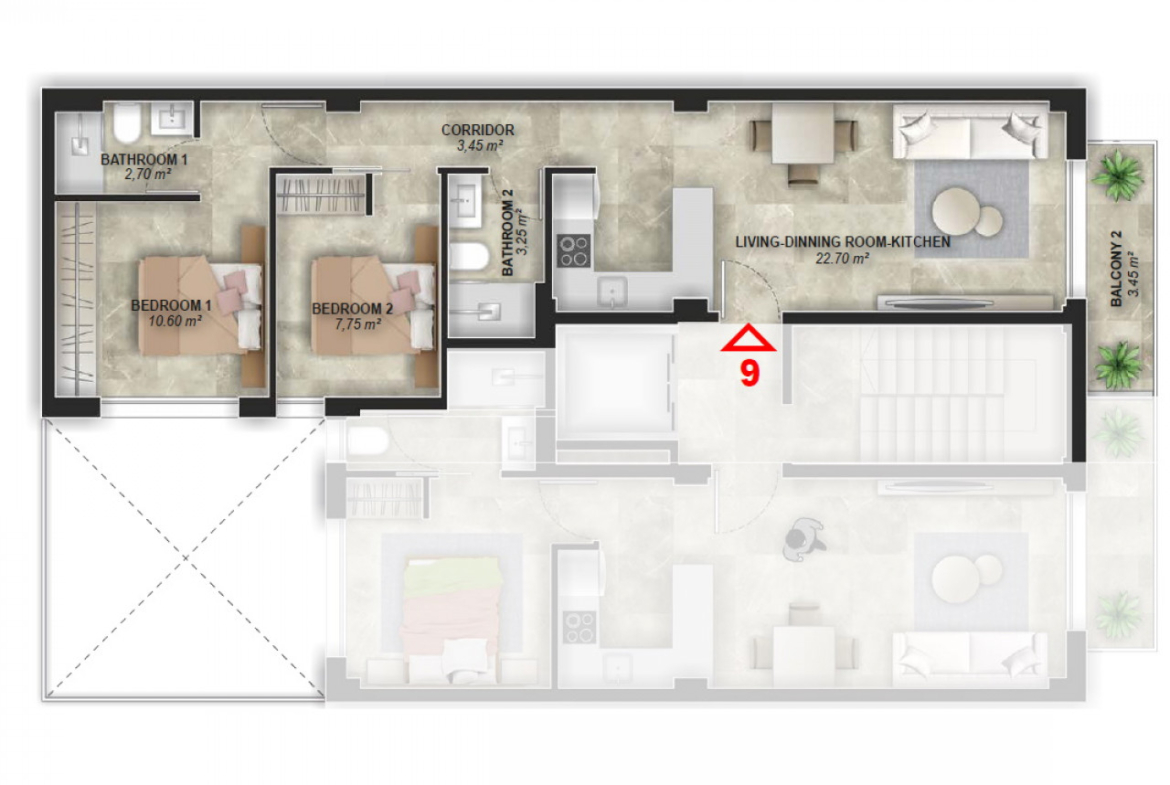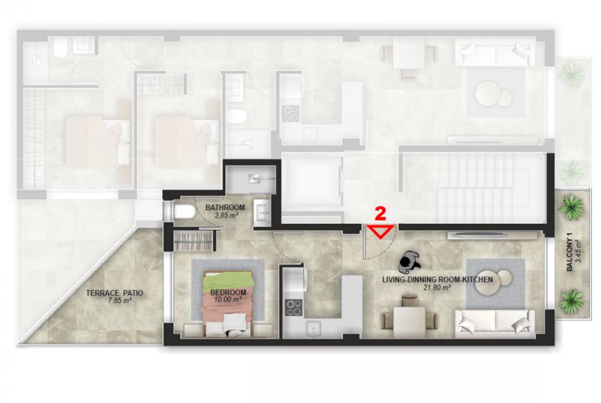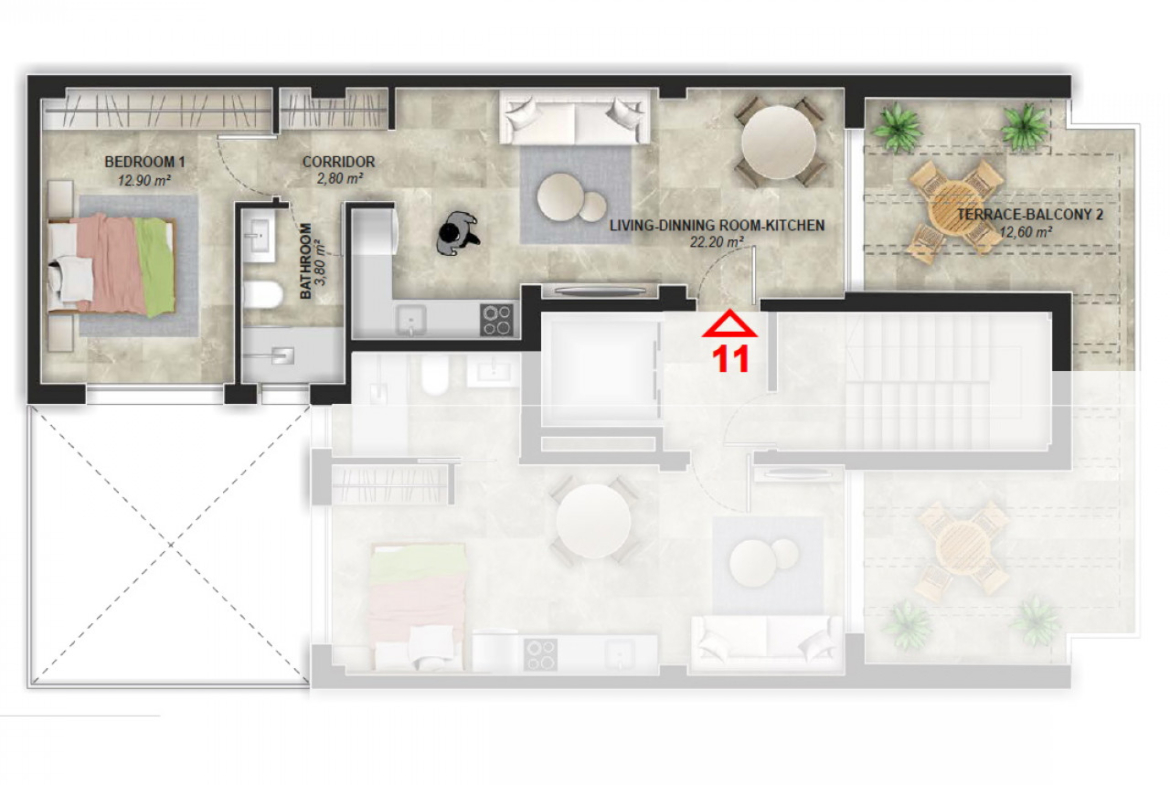 Kompleksą sudaro studijos, vieno miegamojo ir dviejų miegamųjų apartamentai su atitinkamai vienu ir dviem vonios kambariais. Jie idealiai tinka ne tik atostogų nuomai, bet ir gyvenimui ištisus metus. Kiekvienas butas pilnai įrengtas ir paruoštas įsikelti, įskaitant sandėliavimo patalpą pirmame pastato aukšte.