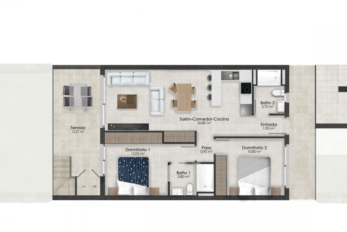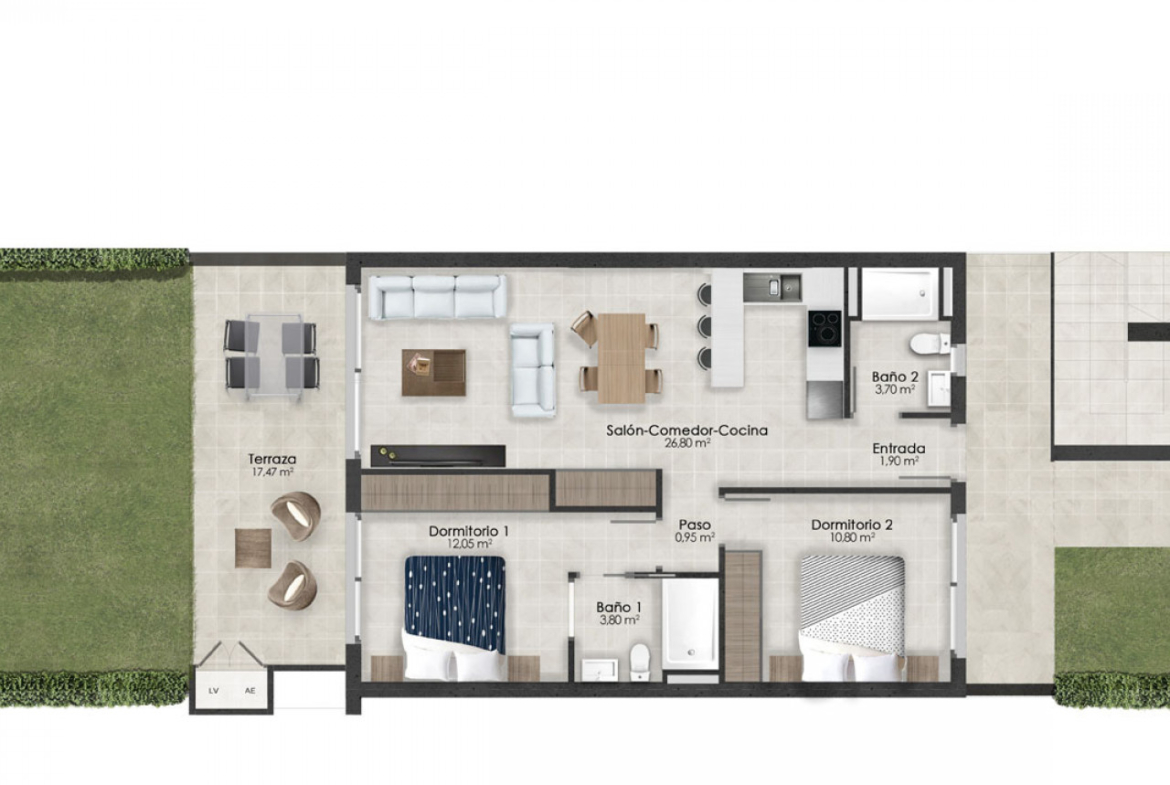 Pastatą sudaro pirmo aukšto apartamentai su dviem miegamaisiais, dviem vonios kambariais ir sodu; apartamentai su dviem miegamaisiais, dviem vonios kambariais ir terasa; bei penthouse su dviem miegamaisiais, dviem vonios kambariais ir soliariumu.