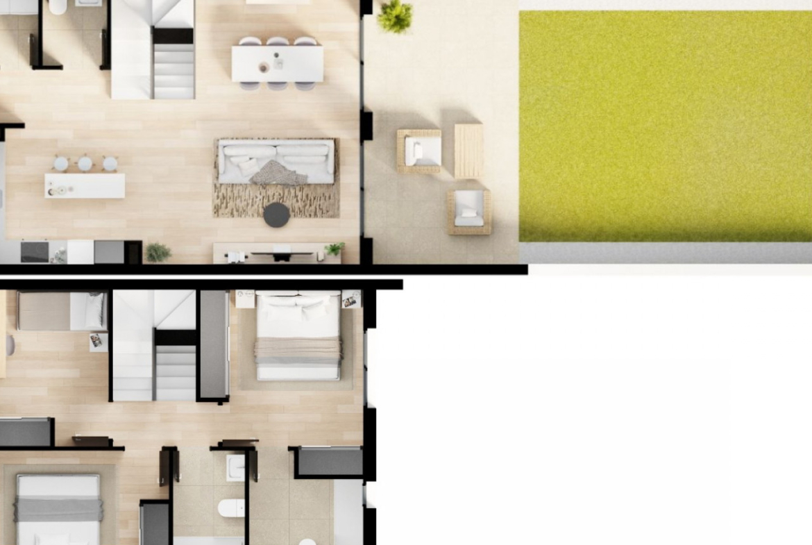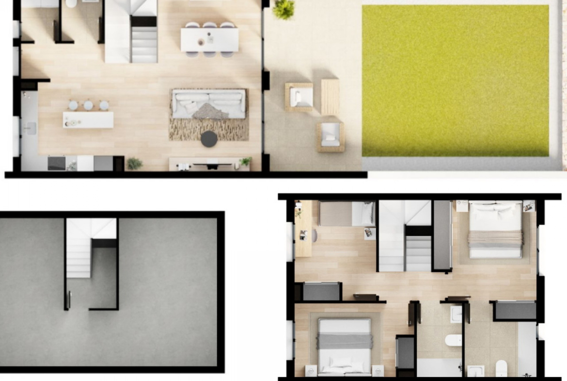 The townhouses feature a modern and functional open-plan design. The ground floor integrates the kitchen with the living-dining area, creating a spacious and bright environment, along with a guest toilet. The upper floor houses the double bedrooms and full bathrooms, designed to provide comfort and privacy for the whole family.