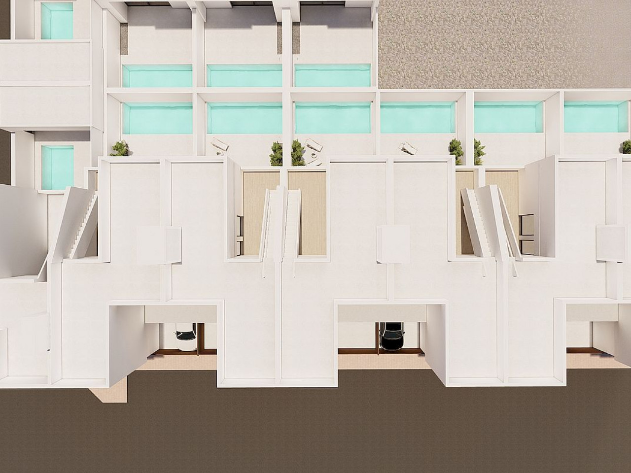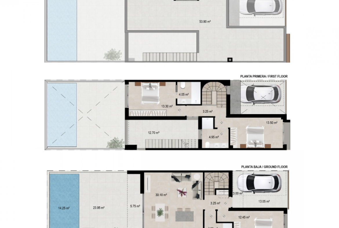 Kiekviename name yra trys miegamieji ir trys įrengti vonios kambariai, suprojektuoti šiuolaikiškai ir atviro plano koncepcija, kurią sudaro pilnai įrengta virtuvė ir svetainė-valgomasis su dideliais langais, jungiančiais terasą ir baseiną.