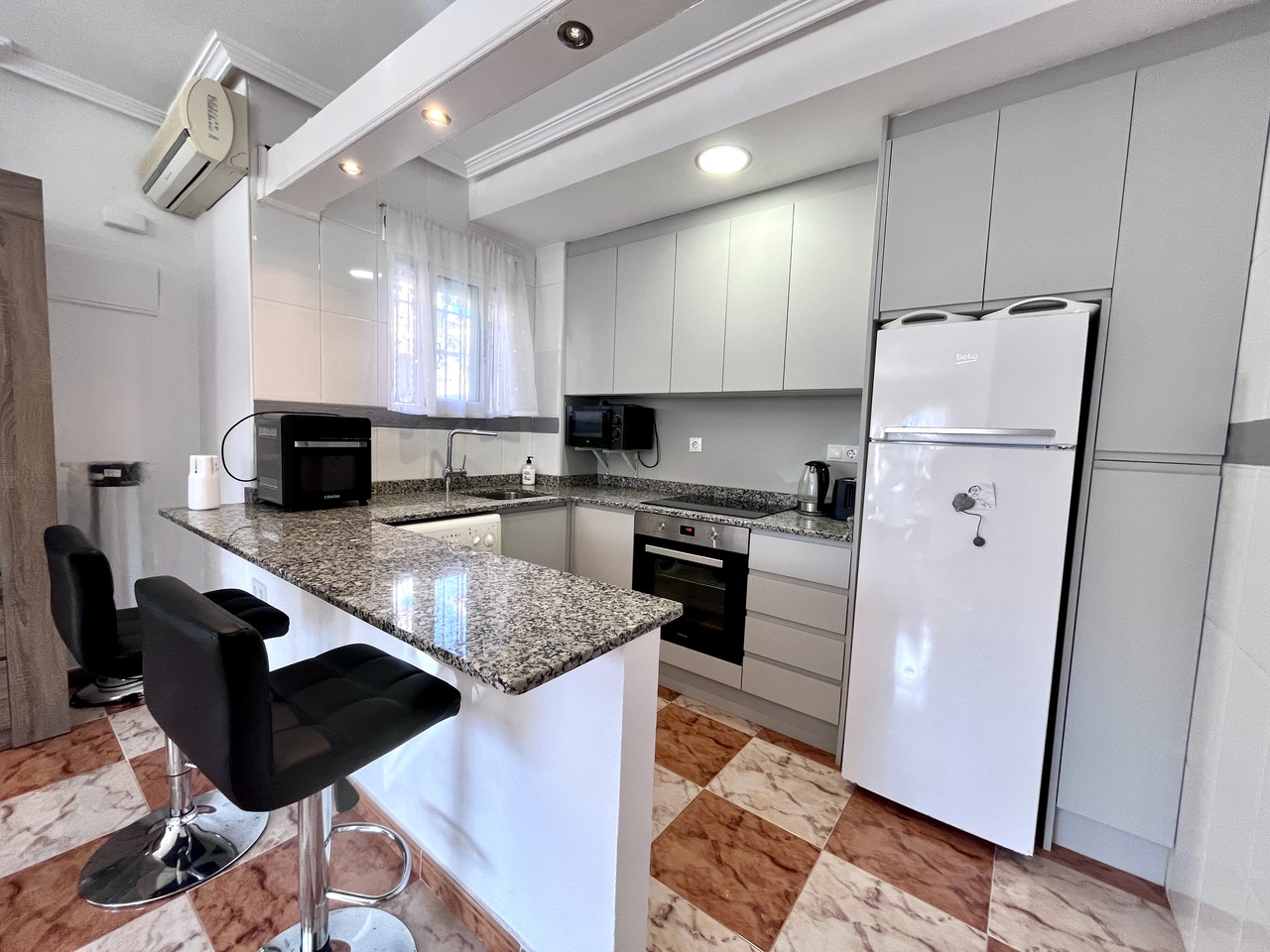 Puiki proga įsigyti šviesų ir gražiai įrengtą 2 miegamųjų ir 2 vonios kambarių keturvietį namą, nukreiptą į pietus, puikiai įsikūrusį ramiame ir labai pageidaujamame San Chosė IV gyvenamajame rajone, La Zenia.
