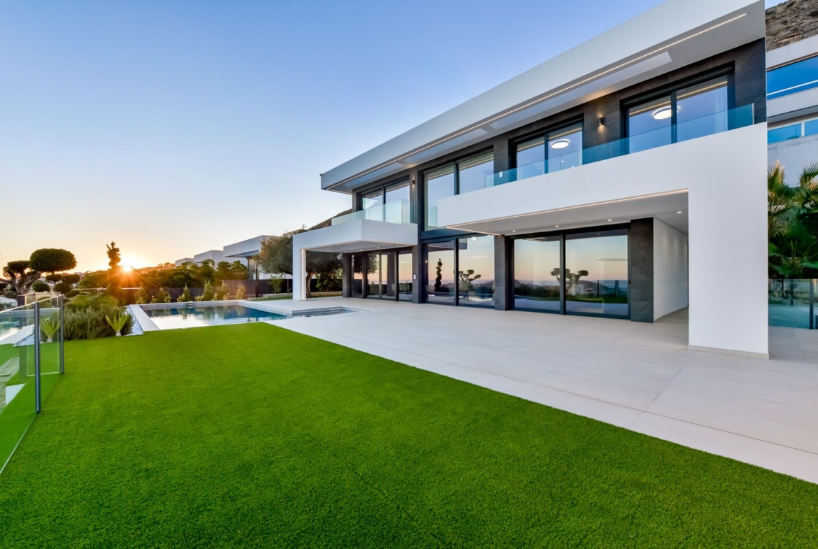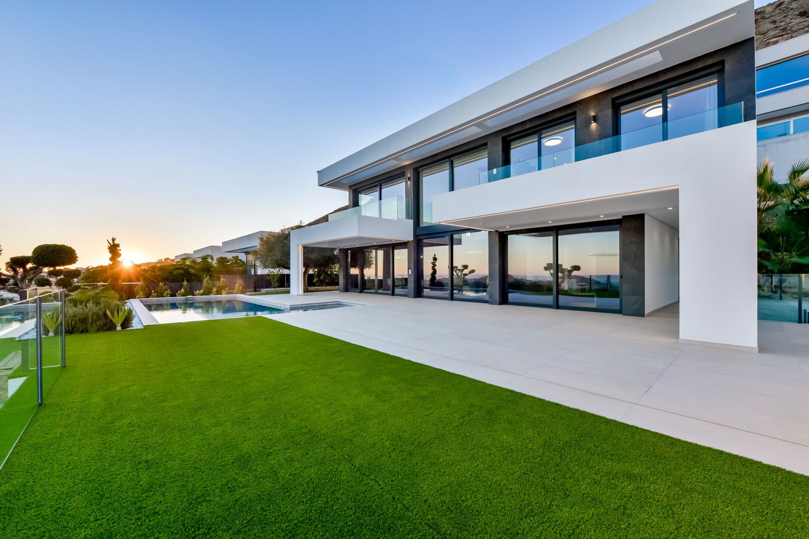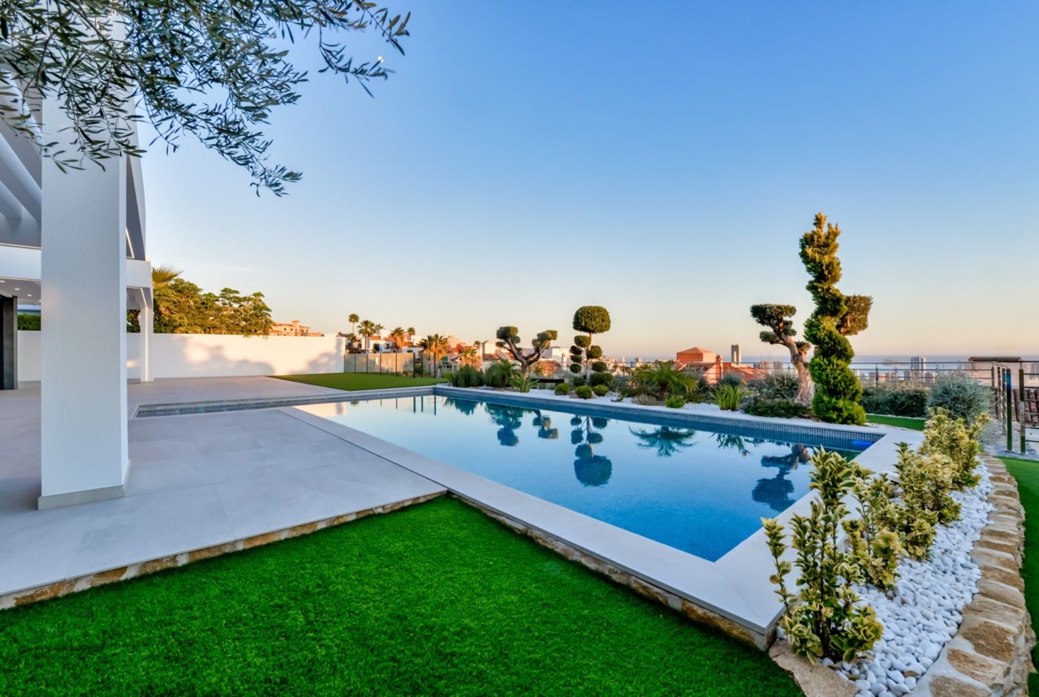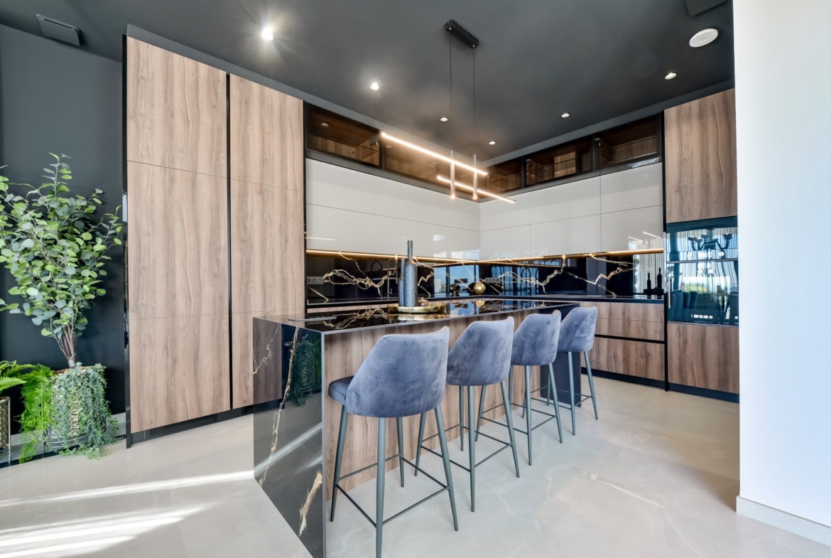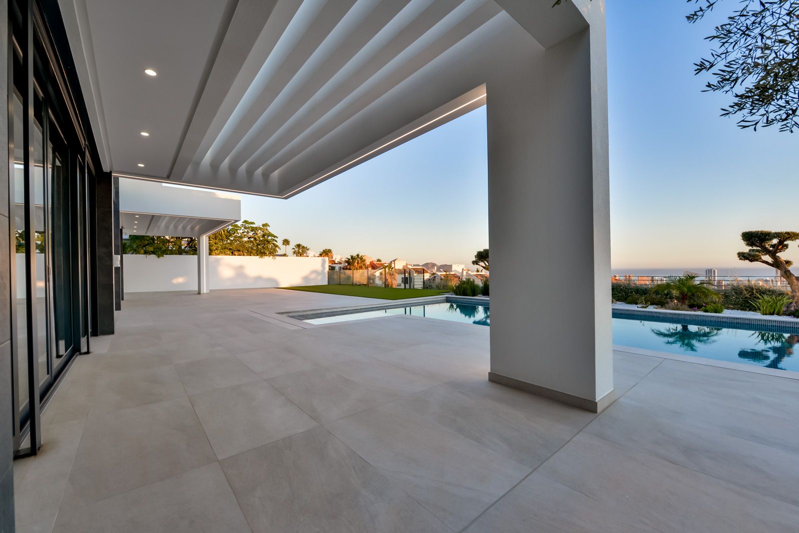 Pakilę į pagrindinį aukštą trimis privažiavimo būdais, matome 130 m2 svetainę su dvigubu apšvietimu, atvirą virtuvę, svečių tualetą, panoraminius vaizdus į jūrą ir 54 m2 baseiną su laminatu, gražų sodą ir 2 dideles dengtas terasas.
