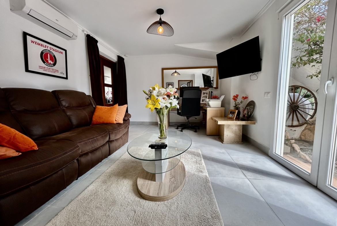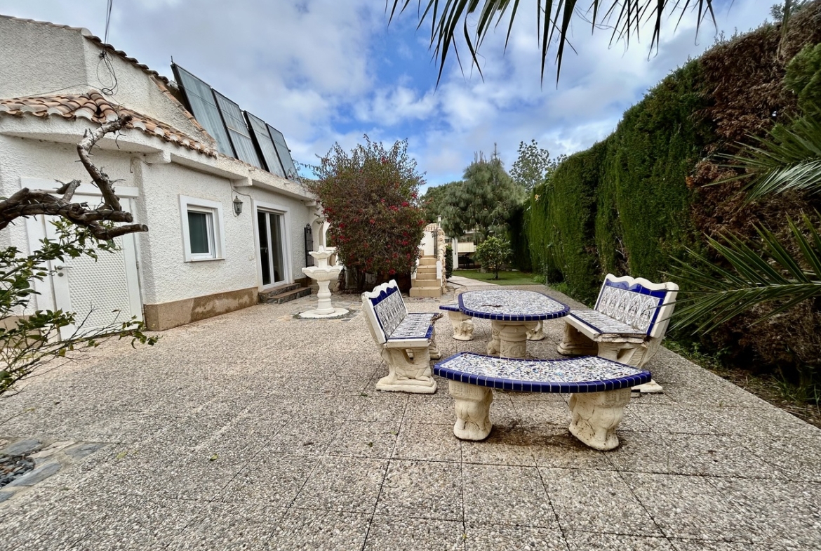 Lomas de Cabo Roig rajone parduodama išskirtinė, pilnai renovuota vieno aukšto vila, kurioje moderni prabanga harmoningai dera su originaliu namų charakteriu. Net 1 300 m² privatus sklypas ir 344 m² užstatytas plotas suteikia erdvės bei privatumo pojūtį, nors visi restoranai, kavinės ir prekybos centrai pasiekiami pėsčiomis.