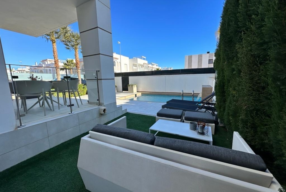 A gated Mediterranean complex with a large green area and three swimming pools, located in the elite part of Ciudad Quesada, Donna Peppa district, surrounded by new modern houses. The bungalow has its own yard and its own Parking. Nearby there are several supermarkets, 3 Schools, kindergartens, a Sunday market with the freshest farm products, bars and restaurants within walking distance!