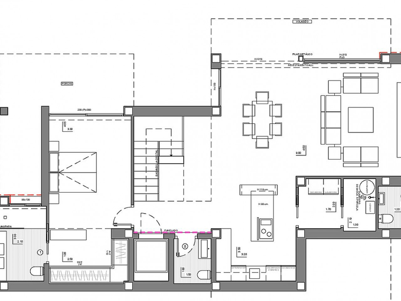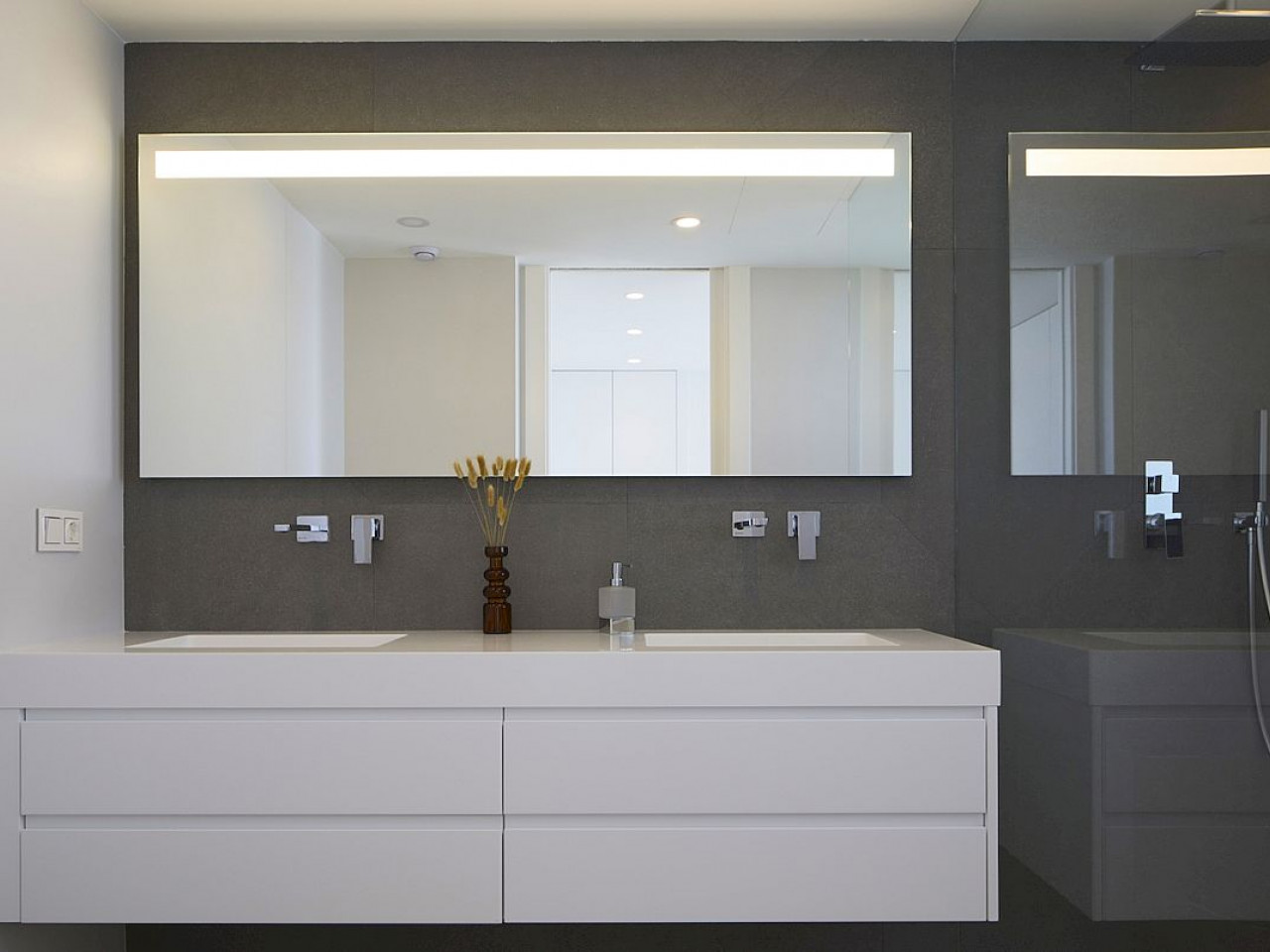 Įėjimas viršutiniame aukšte, kur yra holas, jungiasi su garažu su vieta dviems automobiliams. Liftu arba laiptais galime nusileisti į vidurinį aukštą, kur yra pagrindinis miegamasis ir kiti du miegamieji. Pagrindiniame miegamajame yra vonios kambarys, drabužinė ir išėjimas į privačią terasą. Kituose dviejuose miegamuosiuose taip pat yra atskiras vonios kambarys, erdvios drabužinės ir bendra terasa.