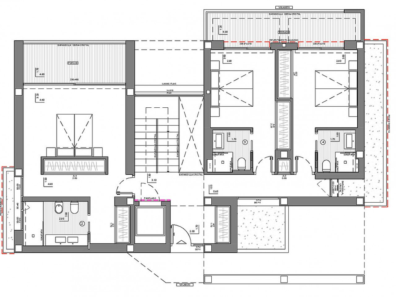 Įėjimas viršutiniame aukšte, kur yra holas, jungiasi su garažu su vieta dviems automobiliams. Liftu arba laiptais galime nusileisti į vidurinį aukštą, kur yra pagrindinis miegamasis ir kiti du miegamieji. Pagrindiniame miegamajame yra vonios kambarys, drabužinė ir išėjimas į privačią terasą. Kituose dviejuose miegamuosiuose taip pat yra atskiras vonios kambarys, erdvios drabužinės ir bendra terasa.